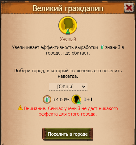 Великий Учёный - увеличивает эффективность выработки знаний в городе, где обитает.