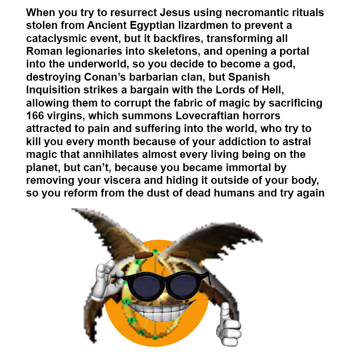 >>1272418 >Spanish inquisition strikes a bargain with the Lords of Hell +15 death gems.