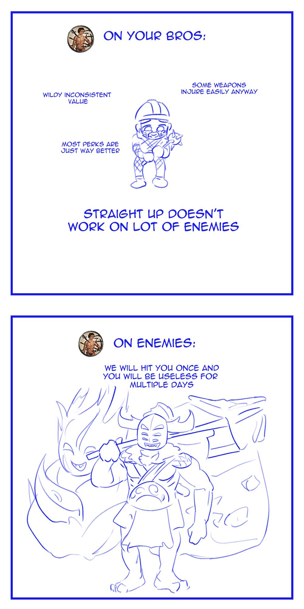 >>1289027 >Там основная фишка это повышенный шанс дропа лута, а не караваны. Караваны можно кем угодно грабить. Я это понимаю, но рп ради хочется грабить корованы, а не стартовых бомжей гонять. >Надо в резерве таскать три тела на забой. Три раба, чтобы не конвертнуло челов на жертву, я до этого быстра додумался, но проблема в их рандомности, то 20 дней таскаемся с 0 ивентов на конверт и жертву, то я найму к стартовым братанам милиционера и жертва выпадает на 6ой день. Очень медленный старт, пока культистов по деревням насосёшь, пока ждёшь ивента у таверны, чтобы нужные челы не ливнули, мне супер не понравилось, хотя стилистически вся эта темка с жертвами мне очень нравиться, до последнего пытался на них играть. >запас порошка счастья Ну это явно не в первый месяц игры. >Лон вульф-полное говно. Поясни. Не люблю старты с крутой экипой в самом начале. Прогрессия игры сделана из расчета старта за бомжей. А лонвульф худший из этих стартов, он супер имбовый и одинокий, игра сделанна для игры групкой плавнопрогресирующих бомжиков.