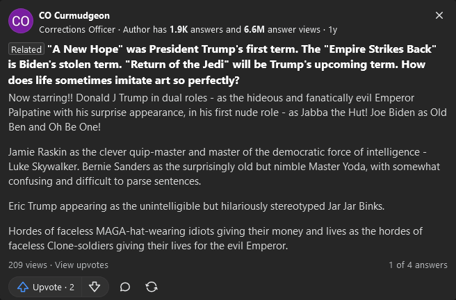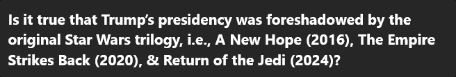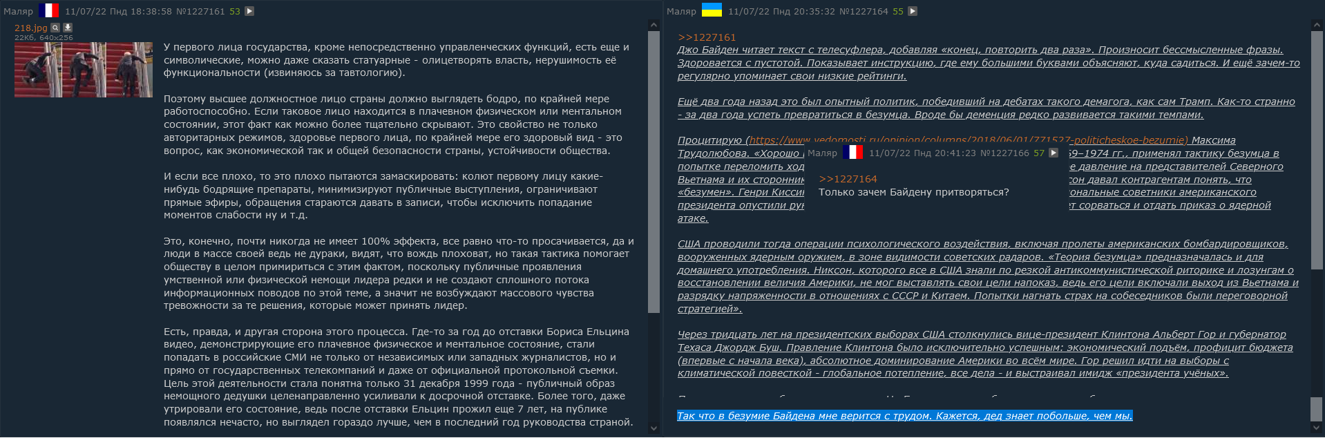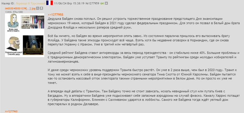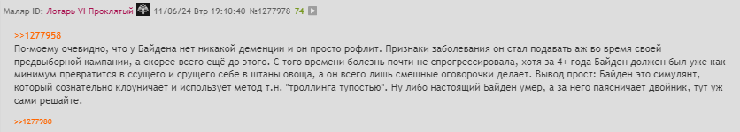 Во время последнего обращения к нации он выглядел бодрым, ясно излагал мысли, не запинался и не сделал ни одной ошибки. В твиттерах пишут: Байден ВНЕЗАПНО стал выглядеть сообразительным. Он либо нашёл лекарство от деменции, либо всё это время одурачивал нас. Я уверен, что Байден исполнил трюк Мизинца из «Игры престолов» и последний год намеренно вёл себя как идиот, чтобы спасти нашу страну. За 7-минутную речь он ни разу не поблагодарил Камалу Харрис. Соцсети предполагают, что победа Трампа — это многоходовочка Байдена со сливом Харрис. Таких постов сотни, а их суммарный охват десятки миллионов.