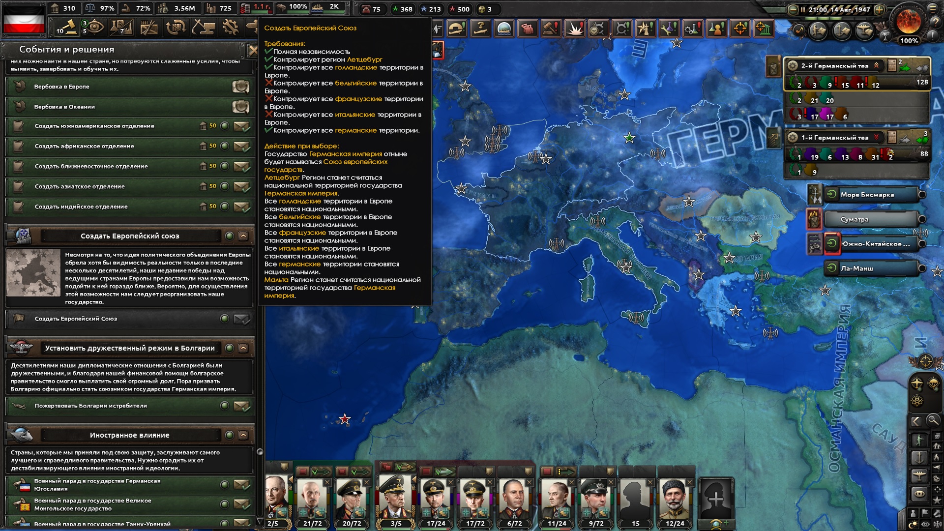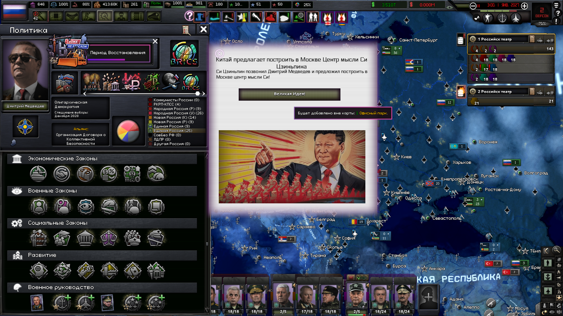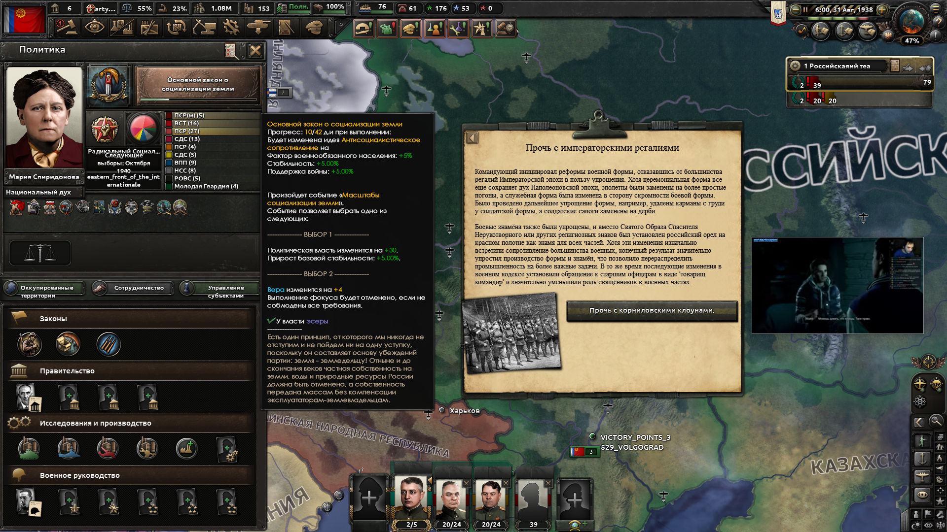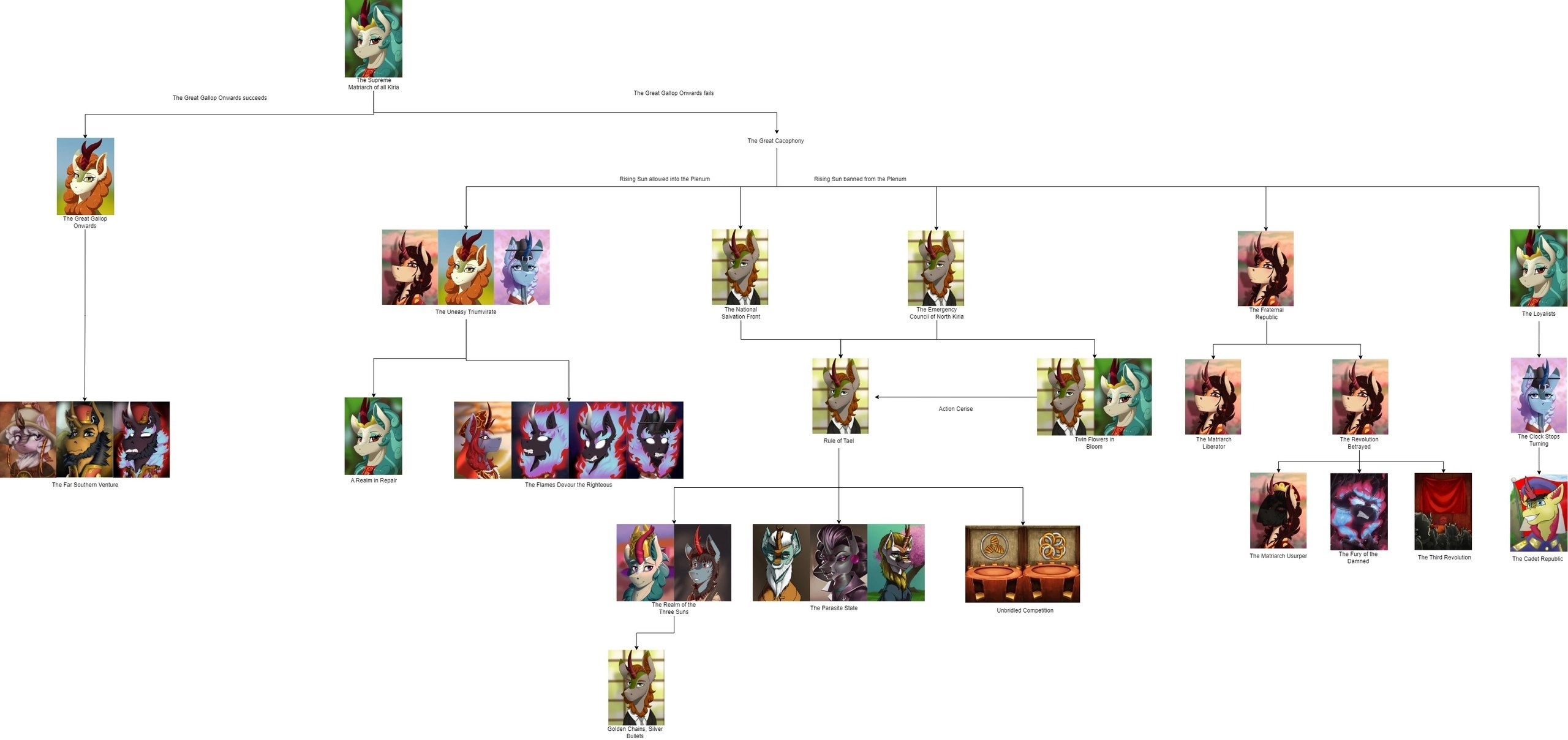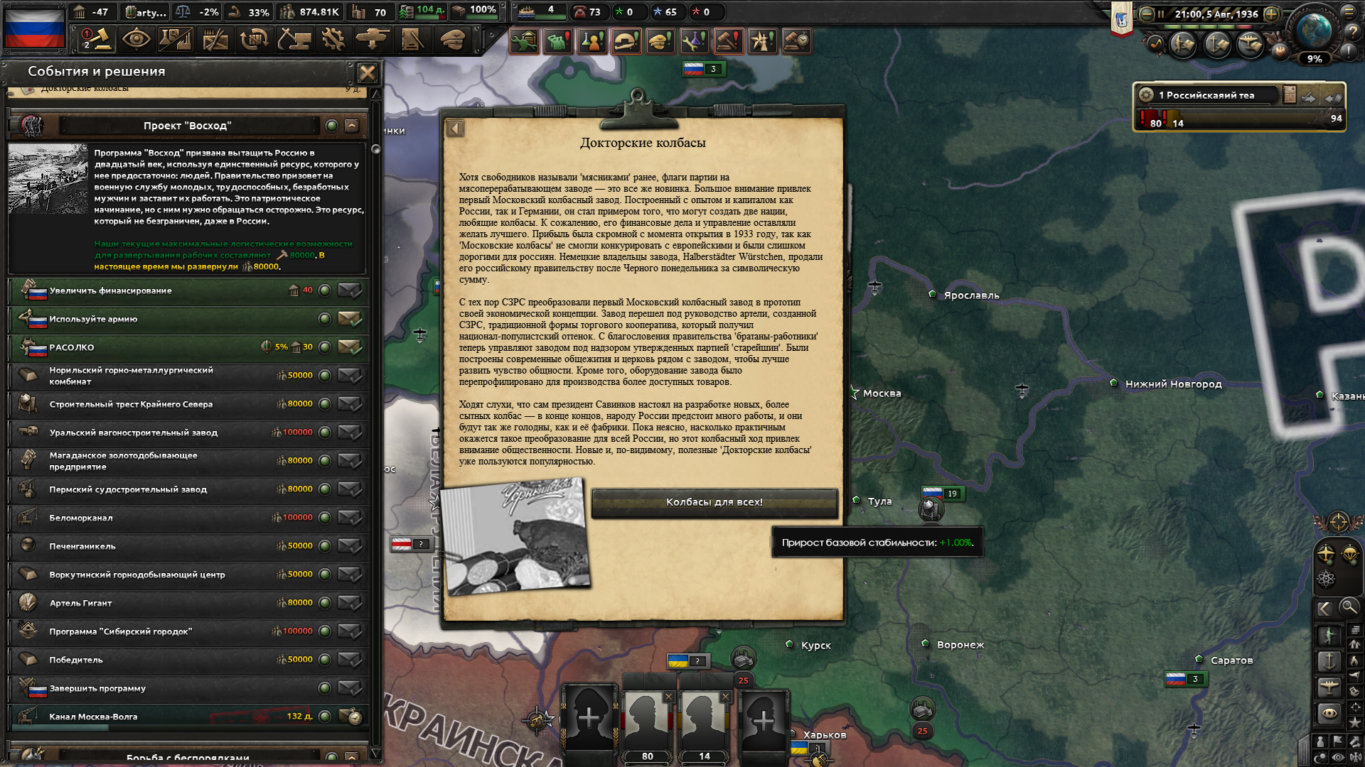 Друзья, скиньте, пожалуйста, у кого есть, пикчу-схему со всеми путями Кирии в EaW. Я откатал за Райзин Сан - матриарха и скажу вам - это база. Революция прошла полный цикл, а я ещё ачивку получил внутримодовую за это! >>1285996 Это я писал. Эквестрия таки одолела Империю Грифонов и я в одиночку экстреминировал неолиберальную военную машину. Зебрику зачистил полностью, а Грифонию - наполовину, т.к. после взятия грифенхейма игра вылетела, оставалось буквально полтора месяца до 1026 года. На этом я и закончил партию - победа очевидна, а я устал. Суммарные потери, с учётом ядерных и термоядерных бомбардировок - миллионов 50-70. Из ~300 живущих в понимире. Сейчас катаю за Кирию по пути НАКП, то бишь севера. Джва вопроса конкретно по ним - какие пути кроме корпоративизма есть? Я так понял, если быстро не национализировать территорию остальной Кипит, то будет восстания - может ли из этого что-то выйти? И ещё - можно ли избежать корпоративной войны, если равномерно распределить им провинции? Ещё, не по НАКП - как получить кадетскую республику? Я так понимаю, надо играть за гармонистов, но провалить Великий Скачок Вперёд. Но не до гражданской войны, а просто не успеть. А чтобы получить нейтралов надо спровоцировать войну двойного отделения, играть за царство, но всячески щемить и попускать гармонистов? У восставшего при Райзин Сан Благоухания есть контент? На гражданскую войну точно есть. В случае победы будет паззитиыный дем. социализм, да? И что за путь Третьей Республики? И у гармонистов с удачным Скачком прям на все на все страны Зебрики есть кастомные марионетки? А все эти милипиздрические островки тоже к Зебрике относятся?