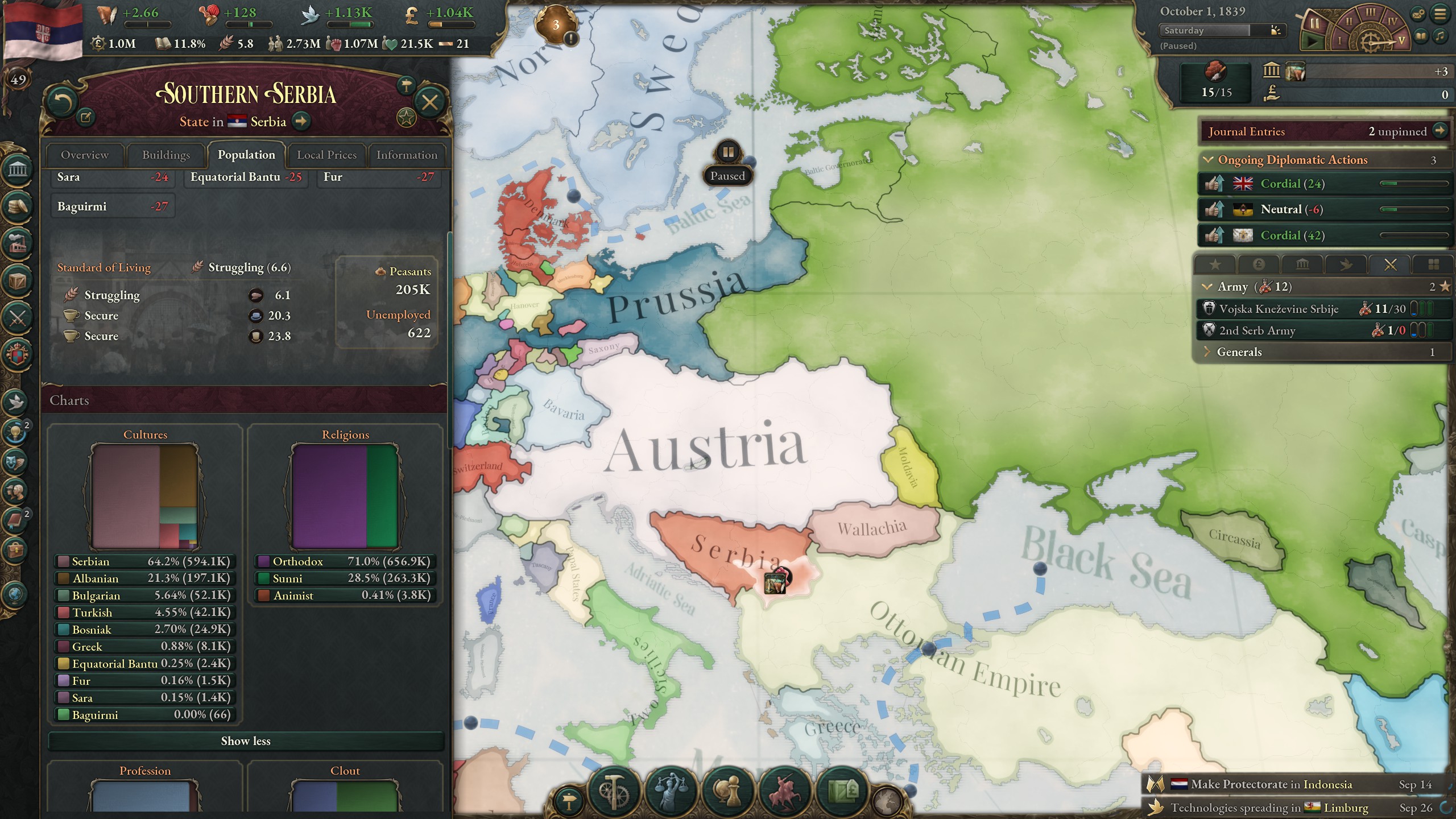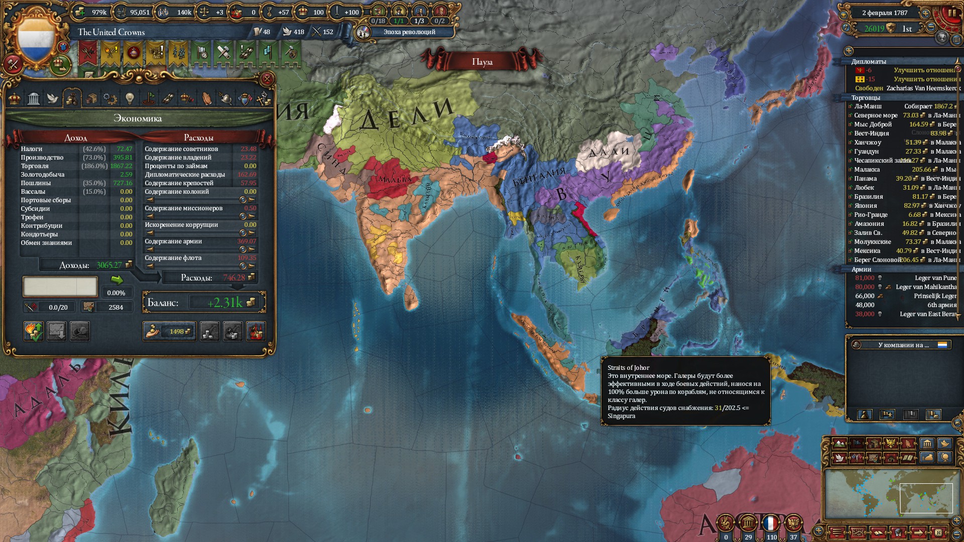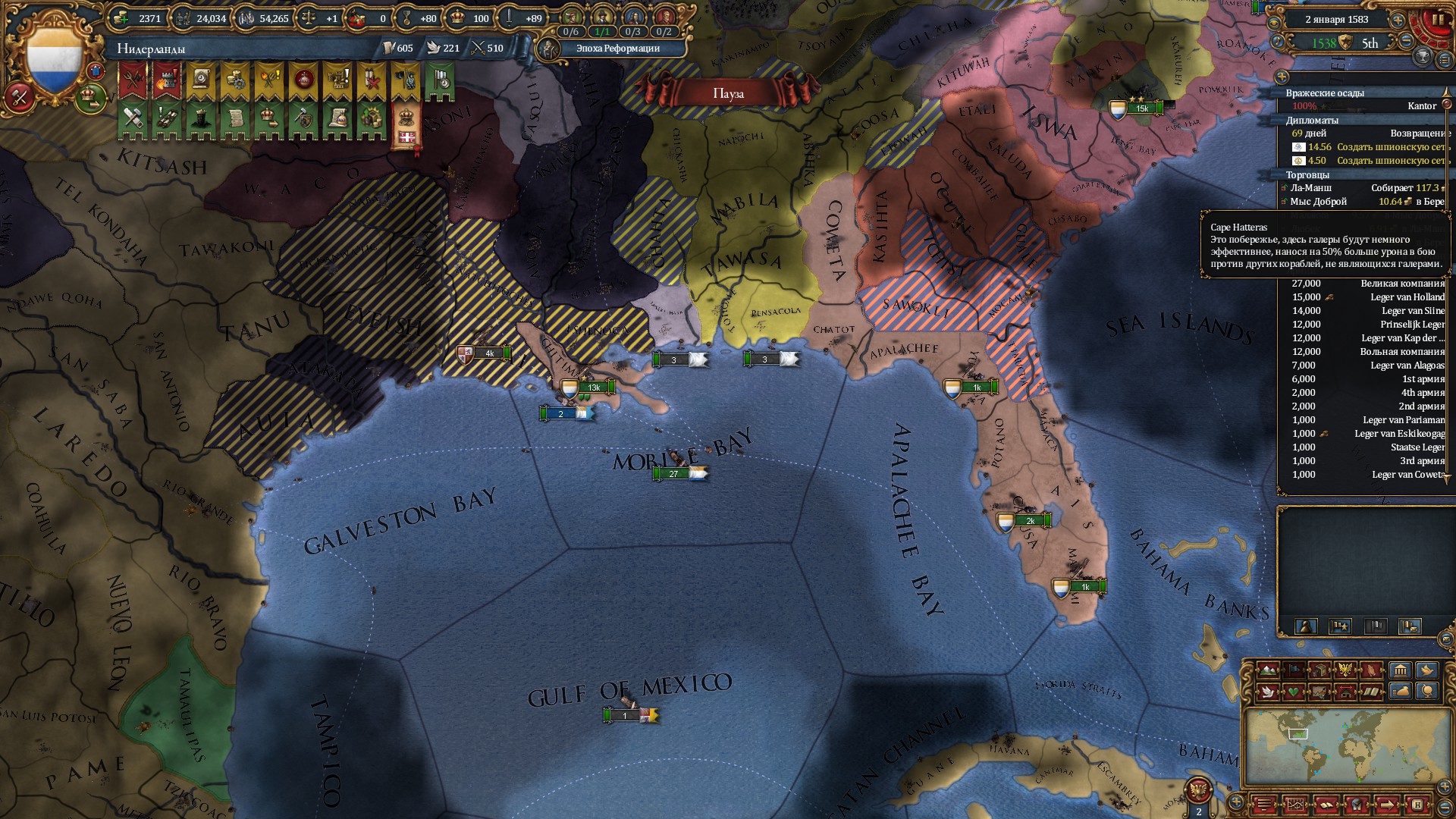 >>1286161 Я тоже уже давненько не играл, но что-то подсказать могу. >Сословия. Да, держи лояльность выше 30, хотя если у сословия нет влияния, то пофиг. Земли отбирай, прожимай агенду. Еще имеет смысл прокликать все привилегии на административные/военные/дипломатические очки. Остальные привилегии по ситуации. >Как лучше воевать Чекай свой combat width и отталкивайся от него. Это то, сколько пехоты может драться в момент боя, остальные будут стоять и получать дебаффы на мораль. До более-менее развитой артиллерии, 13 военный тех, вроде, держи пехоты на combat width + немного сверху. Когда этот стак вступает в бой, то подводи другой стак и отщипывай от него понемногу пехоты в качестве подкреплений. Как появится хорошая артиллерия, то добавляй к стаку ещё плюс артиллерии тоже на combat width. Обрати внимание, что в случае, если пехоты в бою станет меньше combat width, то артиллерия будет получать большой урон, так что лучше держать столько пехоты, чтоб таких ситуаций не возникало. До этого артиллерия нужна по большому счёту ради того, чтобы можно было дать залп по крепости при осаде. Кавалерия не особо нужна, если играешь не за кавалерийский страны, но пару штук на стак держать не подредит. С остальным, типо форсмаршей и штурмов крепостей, разберёшься сам. Имей ввиду, что против ванильной ИИшки можно воевать как угодно, ибо она очень тупая. >Что первостепеннее: технологии или идеи Зависит от того, какие технологии и какие идеи. Если планируешь воевать, то лучше чтобы во время войны твои воентехи не просаживались ниже оппонента, а лучше даже прокачивать их быстрее него. >какие идеи лучше других и почему Хз как сейчас, но квалити, экономику и что-то из оффенсив/дефенсив я брал каждую игру. Остальное по ситуации. Если планируешь колонизировать, то имеет смысл взять эксплорейшон первой-второй идеей. >В игре я вижу параметр "абсолютизм" Оно во второй половине игры будет доступно, так что пока не парься.