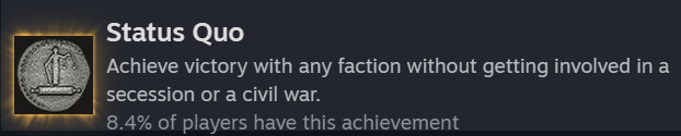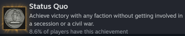>>1293130 Вообще сильно зависит от фракции и сложности. Например Парфия на любой выше нормы буквально неиграбельна потому что столица в минорном и скатывается в мятежи без шансов что-то сделать.