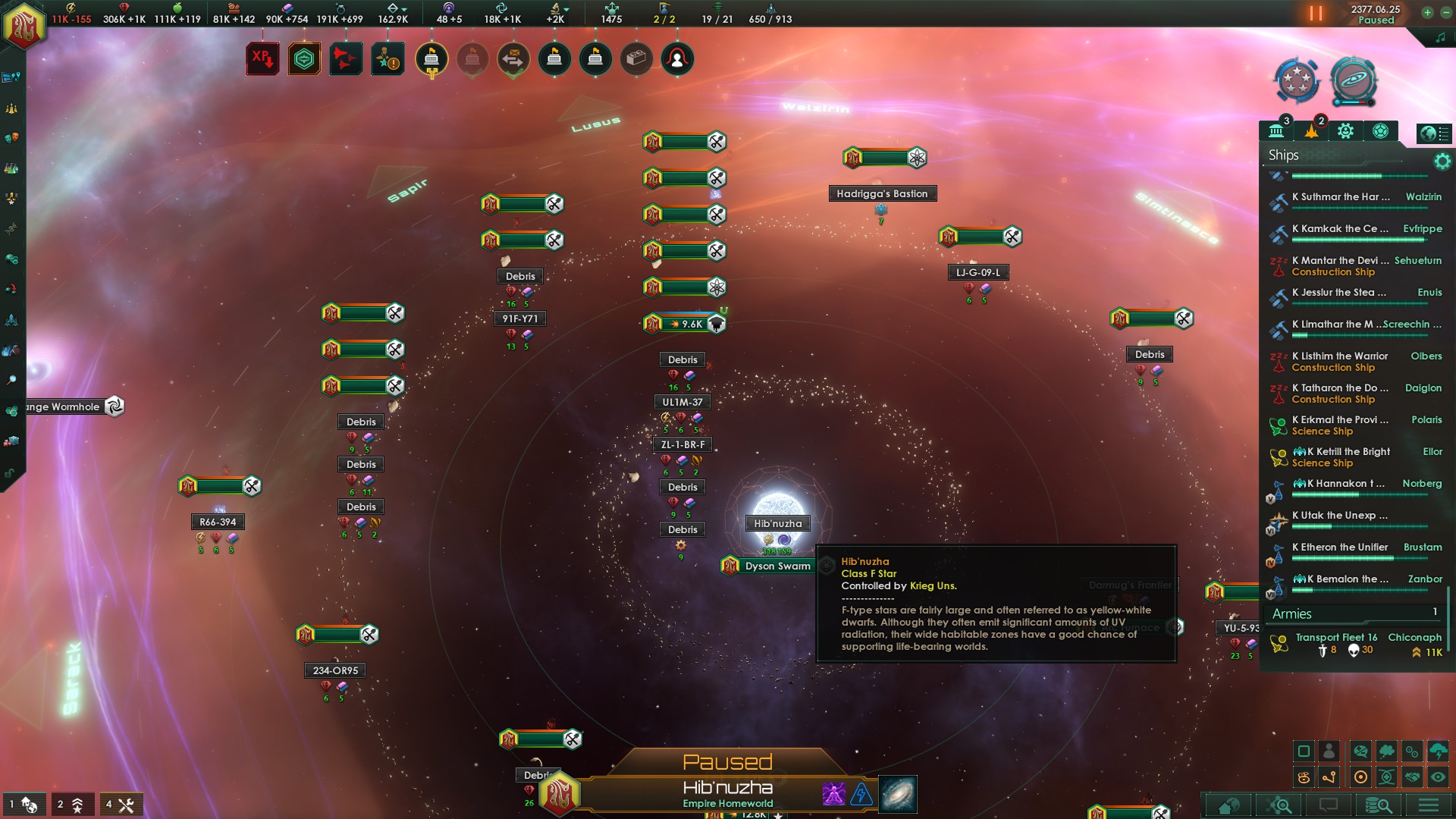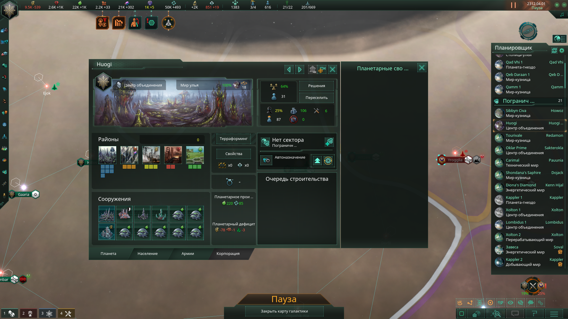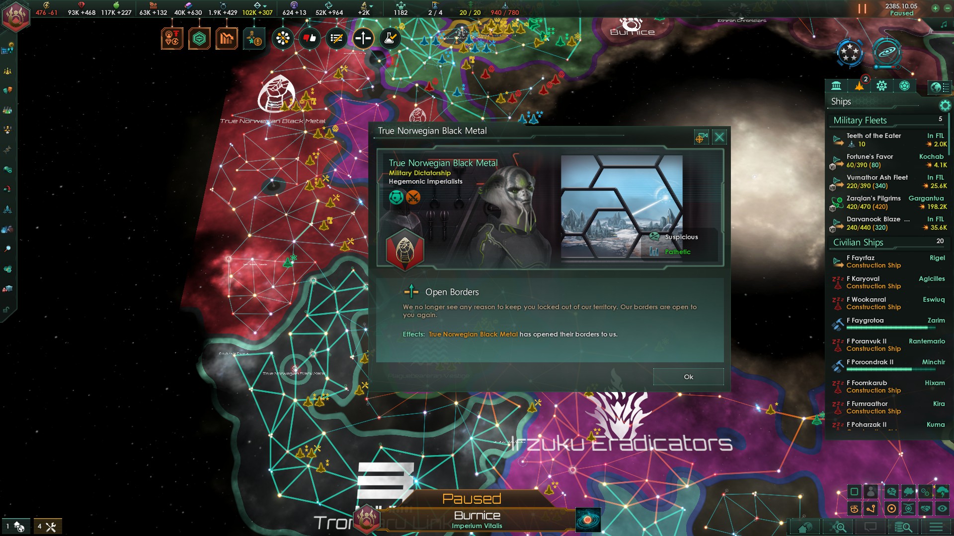 >>1297443 >Я вот только начала игру за безобидный пожирающий рой молодец, начал игру за геноцидников, для которых врагами является вообще всё разумное и неразумное в галактике кроме анклава кураторов >Я только первую планету с примитивами нашёл через 2 звезды от моей столицы, и сразу на неё высадил десант. >почему-то странные скачки - то +60, например, то -200 когда ты захватил чужую планету с населением - это самое население на планете было переведено в разряд корма. захваченное население медленно перерабатывается в пищу, исчезая в процессе - за год-другой население кончится, а вместе с ним кончится и приток еды насчет открытых границ - когда мир заключаешь, открываются границы между заключившими мир империями. как только время действия мирного договора истекает, бот закроет границы со своей стороны бот всегда закрывает границы геноциднику. игроку же нужно закрывать свои границы самостоятельно, ну или не закрывать - как хочешь