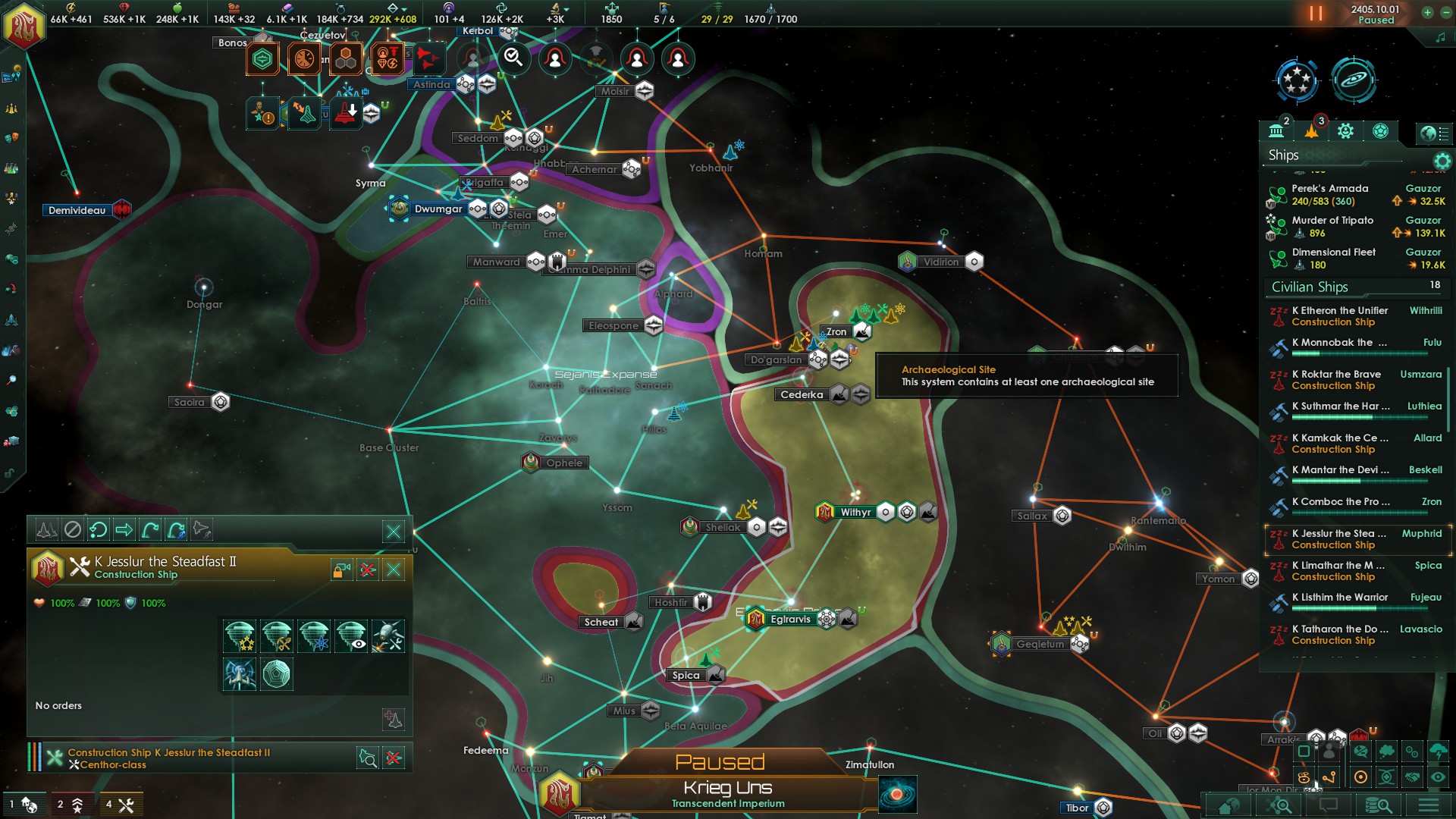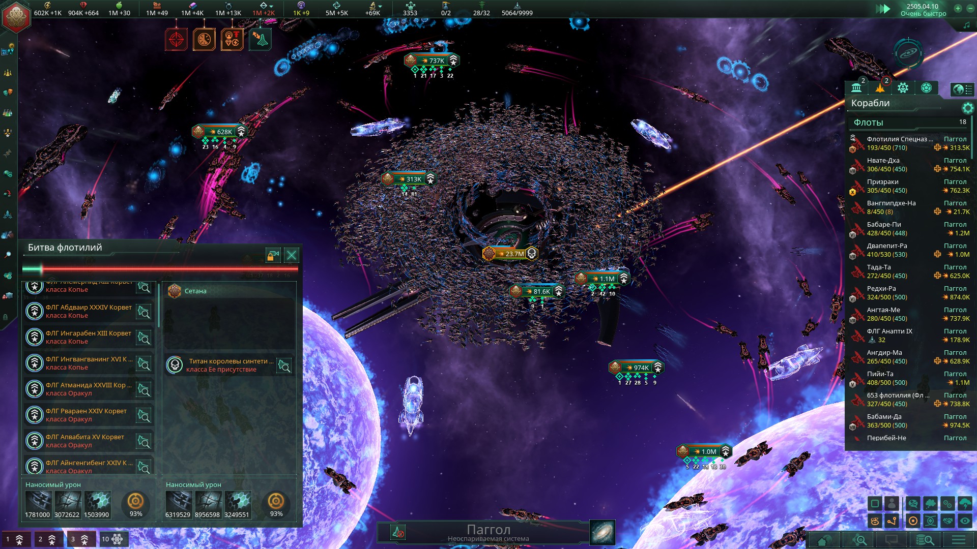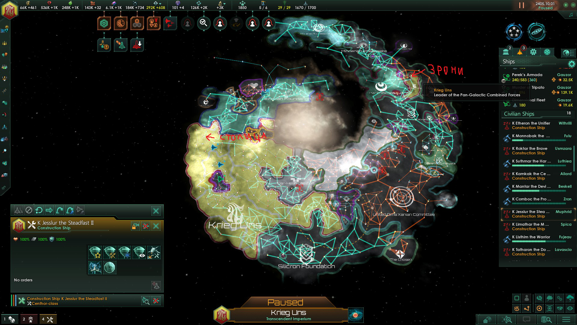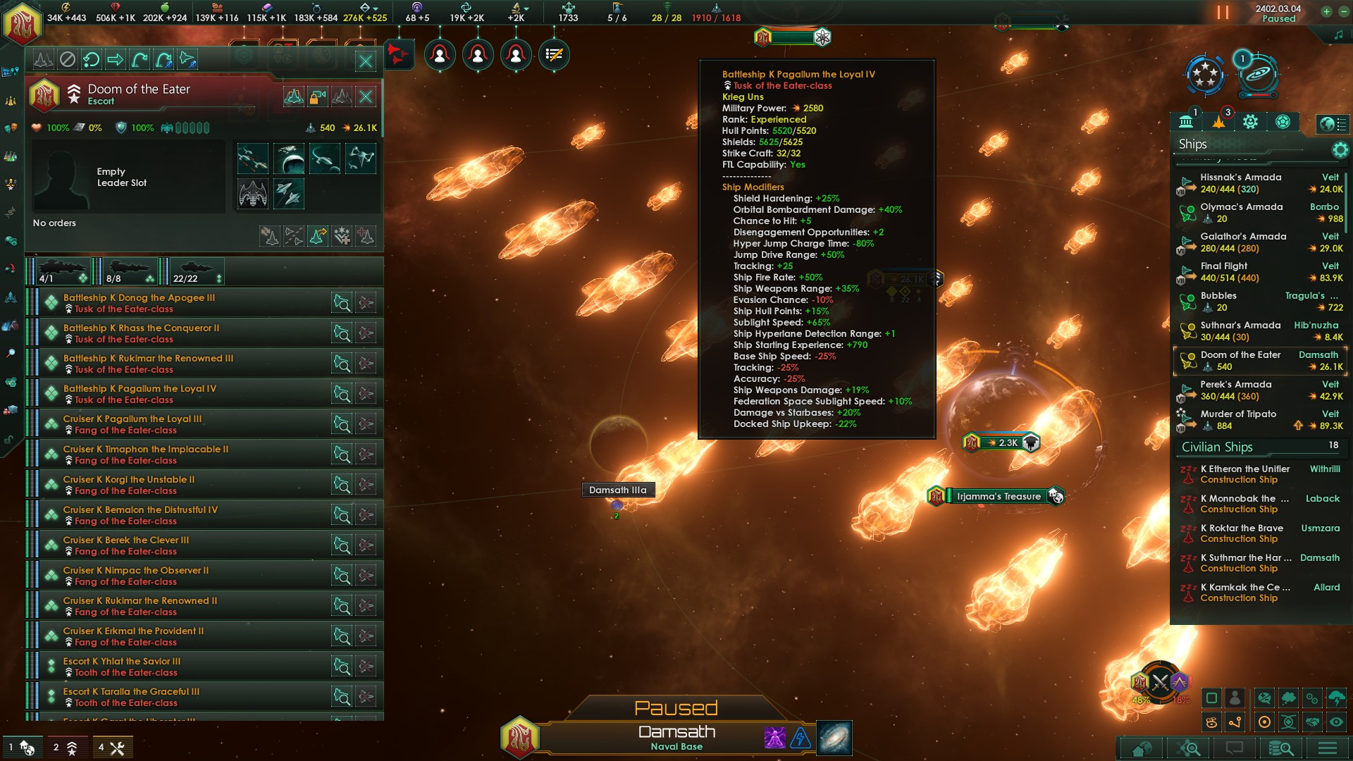 Вот так теперь выглядит максимальный кхорнофлот, вызванный при максимальной интенсивности камлания 50. Почему все раскопки зроней буквально на противоположной стороне галактики от меня? И это я еще подсуетился и заплатил 400 влияния чтобы туда аванпост пробросить от ближайших врат.