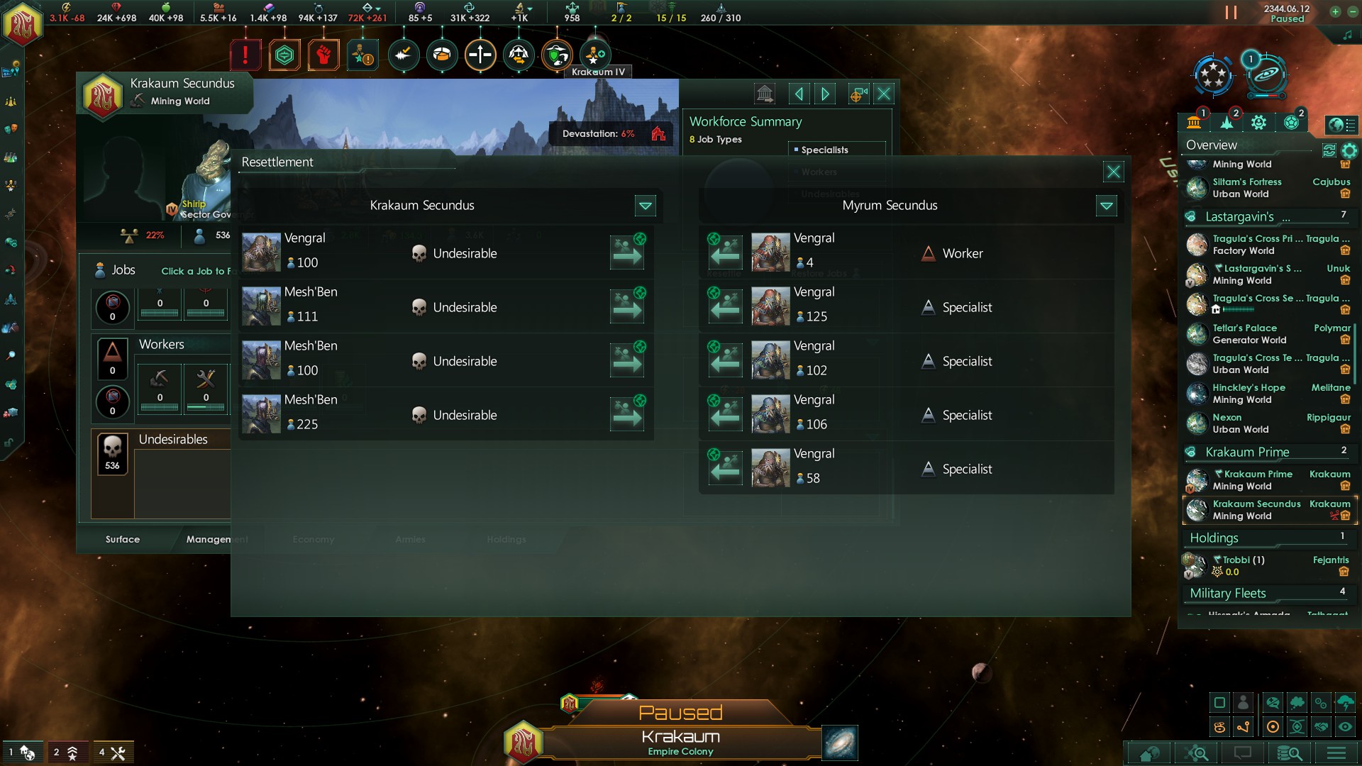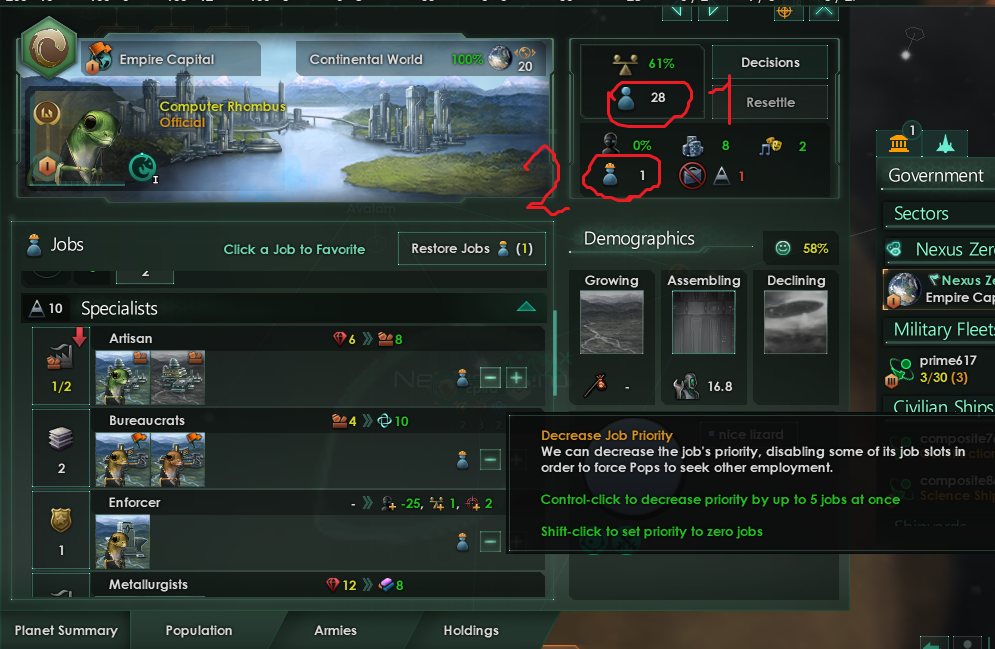 >>1297450 я смотрю на скрин и вижу, что у тебя в столице дохуя населения, а на планете-ферме 15 землекопов энергию добывают. следи за тем, чем конкретно занято население на твоих планетах, смотри на количество доступных работ в принципе и количество занятых конкретно сейчас тебе неплохо бы слегка нарастить производство энергии, заметно нарастить производство пищи, и на всё это дело придётся переселить часть населения с столицы, прикрутив краник науки, или чего нибудь еще при этом, если ты просто переселишь ученых/иных специалистов, то на их место тут же встанут попы-рабочие, так что для таких маневров нужно так же ограничивать количество работ, которые в данный момент не нужны. на скринах примерно описано, как ограничивать количество работ - сперва открываешь детальный список работ, потом уже их минусишь. позже, как появится лишнее население, можно вернуть все взад