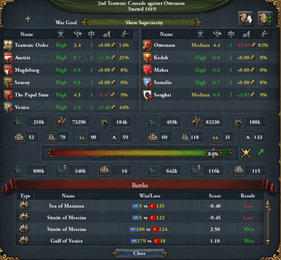 >>1296811 >местность Самый прикол, что у меня и преимущество по местности, ибо фул кава 105% соотношение так что нет штрафа на ровном ландшафте против его пехоты и 2 кавы. >генерал У моего генерала пипов на 2 больше. Единственное, что у моего больше шока, а у него фаера. Походу в первые дни на фаер фазе он выбросил максимум на кубике, который я проебланил и не увидел, и дальше мои были в меньшистве.