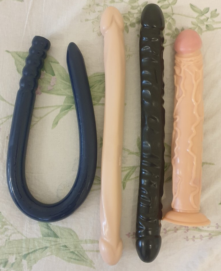 Вот мои 4 (слева направо): 1. 75 см, диаметр 32 мм (сейчас сам измерил, хотя на сайте пишут, что 30 мм), который и пытаюсь принять целиком. Казалось, что сужающийся кончик будет этому способствовать, но нет, всё равно упирается пока намертво в сужение.