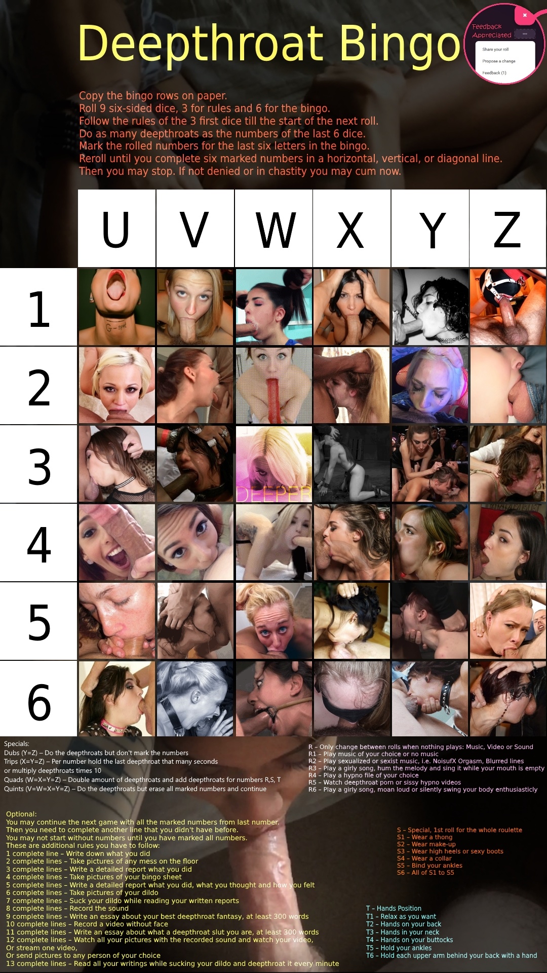 Выполнял эту рулетку ( https://www.faproulette.co/2663/deepthroat-bingo/ ) года 4 назад, когда желание отсосать было на пике. У меня заняло минут 30, но по ощущениям где-то часа полтора. Поначалу пытаешься просто преодолеть рефлекс и заглатывать как можно аккуратнее, следя за дыханием, сплевывая в аккуратно в миску и т.д., но чем ближе приближаешься к концовке, тем больше становится все равно на формальности и ты начинаешь долбить себя в горло как последняя шлюха, лишь бы поскорее победить челлендж. Сложно описать словами, но чем дальше, тем больше выпадает повторных клеток, которые не приближают к завершению, а лишь заставляют долбить себя как бы в пустую, что в свою очередь повышает азарт в надежде сделать нужное количество заглотов и поскорее сделать следующий ролл. Наткнулся на этот тред и захотелось повторить, только тогда у меня была 3,5 см в диаметре игрушка, а сейчас 4,5 или 5,5. Попробовал с 4,5 и думаю нужно попрактиковаться прежде чем приступать к серьезным играм.