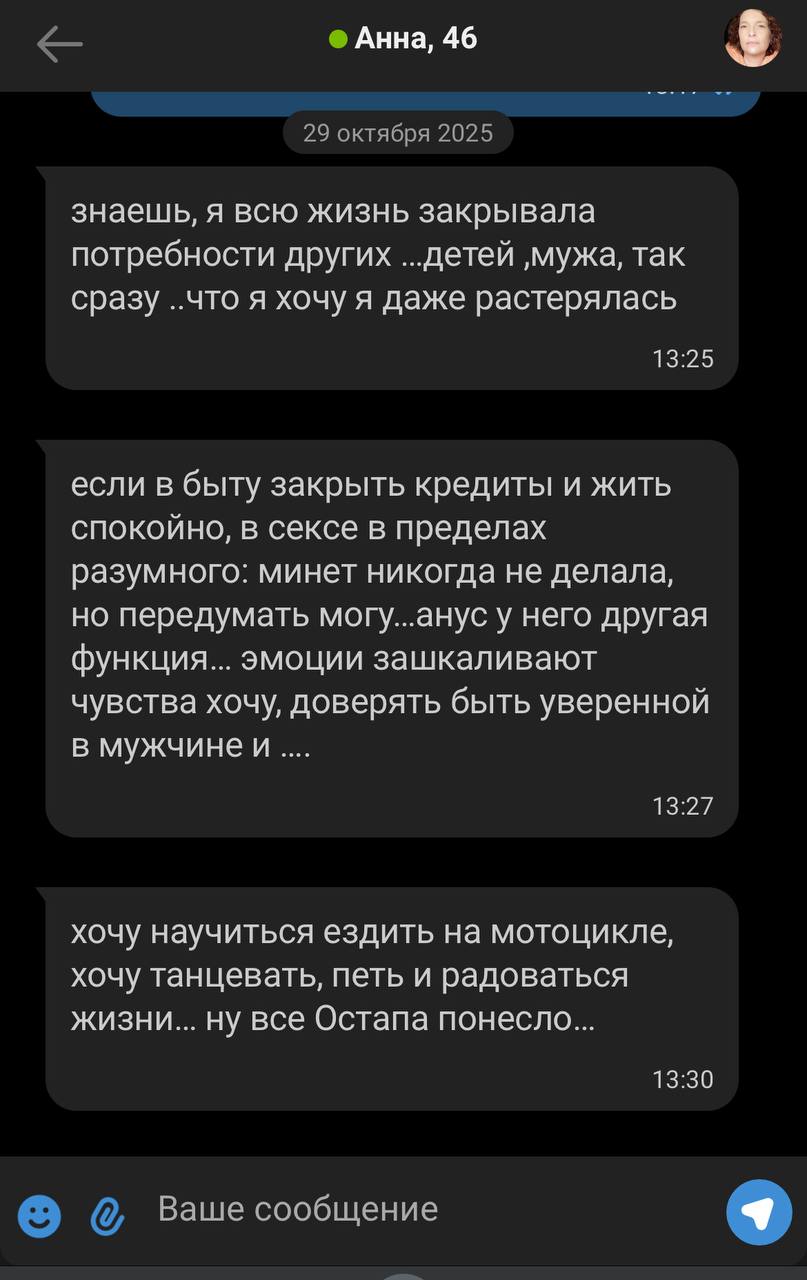 А я чёт кароче начал отходить от этой темы, задумываюсь о вечном видимо. У меня чёт проснулась совесть и не могу ебать таких тётушек за 60, которые уже одной ногой в могиле и всячески цепляются за уходящую жизнь всякими поёбками с такими двачеро-жиголо лол. Все эти поёбки это копиум перед неминуемым уходом, который произойдёт через 10-15 лет ( а ебать их перестанут уже лет через 5 максимум), попытка отвлечься от мыслей о смерти (как впрочем, и всё, что мы делаем в нашей жизни). Совесть мне не позволяет нарушать тихий уклад этих грэнек и врываться своей стоячей писькой в их размеренный остаток жизни. Они же ещё привязываться, и успаси Господь, влюбляться начнут. Ебал как-то 61 лвл 2 раза встречались, она мне пишет после первого раза СПАСИБО ЧТО ОЩУТИЛА СЕБЯ СНОВА МОЛОДОЙ С ТОБОЙ, бля ну это пиздец, на 2 часа подарил бабуле счастье, а потом опять мысли о кончине. Она после второго раза написала, что нам лучше прекратить общение, ну а хули, потому что больно падать после двухчасового отвлечения на еблю. Другая тоже была 60 лвл, я ей комплименты хуё-моё, много по вацапу говорили, переписывались, говорит уже 20 лет не получала мужского внимания, худая , ниче так на лицо для её возраста, но тоже максимально скромная, мог бы к ней на квартиру приехать, познакомиться по старой схеме, но я её выебу, и уеду , а ей страдать с ощущением приближающейся старости и смерти, не могу , совестно.