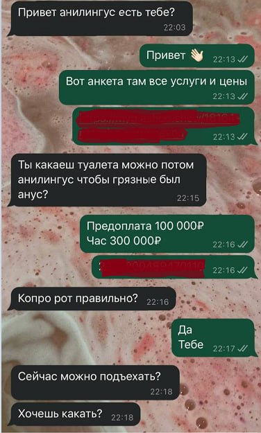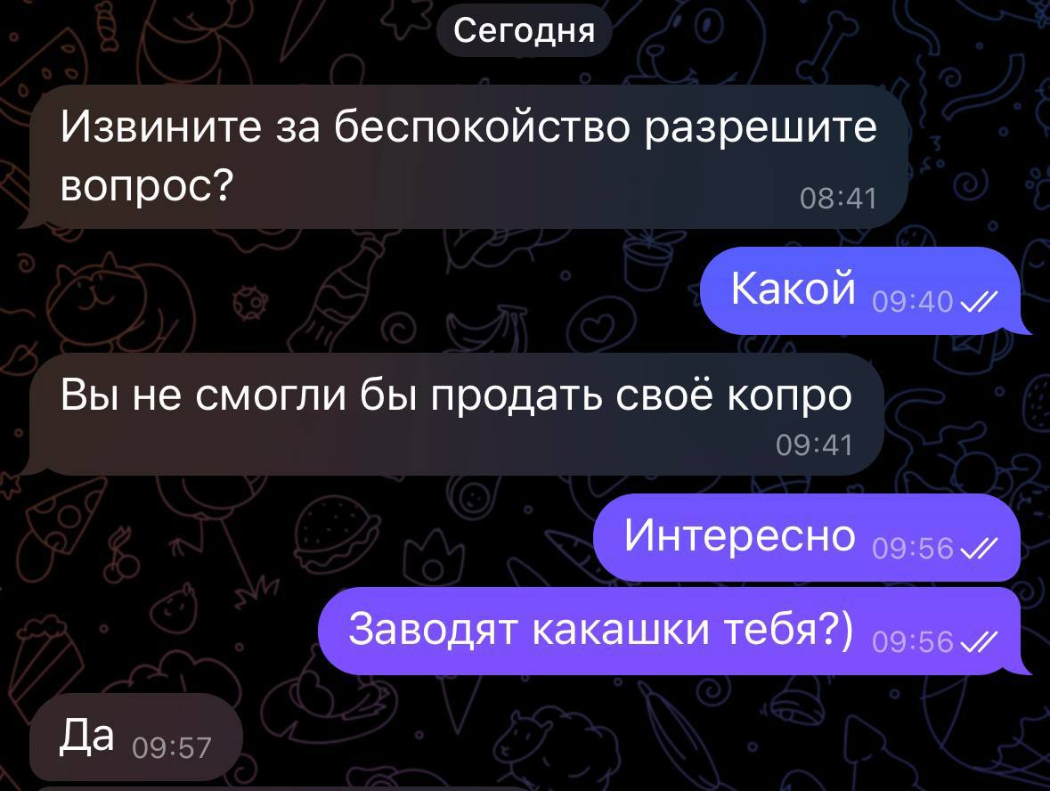 >откуда ты знаешь, что это говно из-под няшной тяночки, а не не свежее говно из чёрного мешка для мусора? Во-первых, те тяночки этим занимаются годами, и отзывов у них овердохера. Во-вторых, это их "бизнес", и делать что-то вроде наёба клиентов им смысла нет, так как всё быстро разлетится по закрытым группам и её заблочат, следовательно потеряет заработок. В-третьих, представь себя на месте тяночки, которая продает подобные вещи. Тебе есть смысл заморачиваться и искать чужое, собачье, кунское, бомжатское говно, чтобы его потом продать?! Предварительно собрать и запаковать. Не проще ли самой аккуратно и чисто всё сделать за 5 минут, упаковать и отправить, получив приятный отзыв и немалые деньги?! Не думал об этом, нет?! В-четвертых, когда она это делает, то отправляет фото и видеоотчет, как она срет, собирает и запаковывает. (это за доп плату, для особо недоверчивых)
