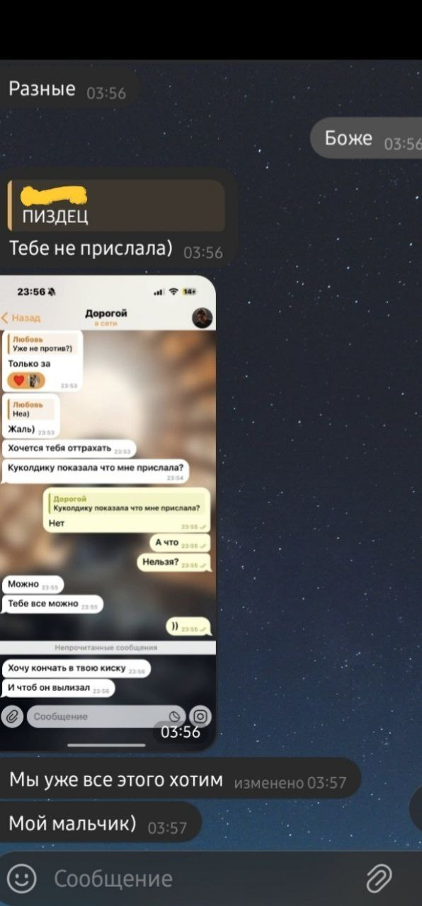 Набрал в строке поиска «секс» в переписке с женой и за 2023-2025 , от нее за это время получил сообщение хочу секса 23 раза. За это время познакомился только с одним ее парнем, остальные и не знали что я знаю. Из интересных мужчин у нее был коллега по работе, вертолетчик, сотрудник ООН, мой одноклассник, ее собственный одноклассник, офицер , таксист