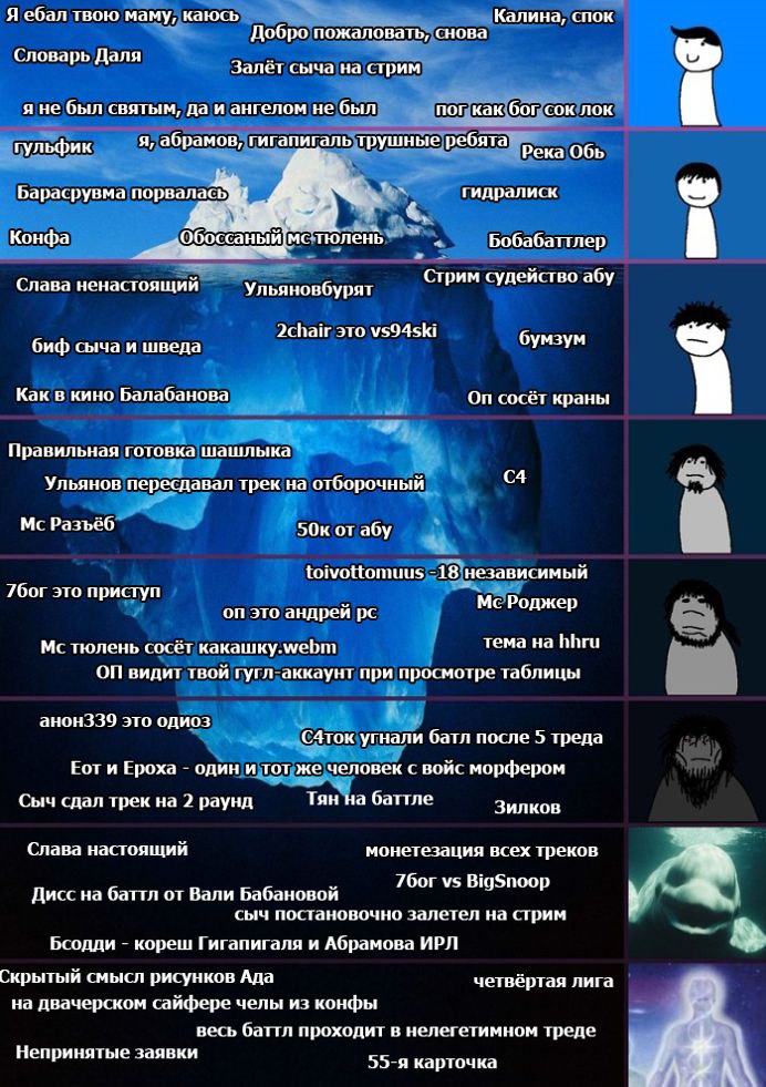 Регламент: Тот же самый что и в прошлый раз. Сдача треков происходит путём загрузки файла трека по форме (в оп посте для отбора, в остальных раундах форма будет приходить на почту участника). Также если очень не хочется палить фейкомыло трек можно сдать в тред с каким либо пруфом который подтвердит твою личность, например огромный самотык с автографами Альбины Сексовой и Стаса Барецкого, хуй знает. Просто кидаете пруф, ссылку на трек и свой ник. В следующих тредах при выставлении оценок и сдаче следующих треков нужно будет также использовать ПРУФ КАК ПРУФ. Для каждого раунда определена тема (или несколько тем, в таком случае достаточно раскрыть лишь одну тему на выбор) и ограничение по длине трека (можно незначительно превысить на 10 или 20 секунд если прям совсем нужно, но не наглеть). Батл одиночный, не командный. Для всех должно быть очевидно что на треке участвует один человек. Начиная с парных раундов разрешены гостевые участники для бэков, припевов и прочей подобной лабуды. При этом гость должен занимать меньше четверти трека относительно участника батла. Леваки сдавать запрещено, определяются путём несоответствия трека теме раунда. Виртуалы (участие в батле под несколькими разными никами) запрещены. При раскрытии виртуала участник будет дисквалифицирован вместе со всеми раскрытыми виртуалами. На одного человека только один трек. Никаких СуноБотов. Исполнять должны вы. ВойсМорфер использовать можно. Первый раунд — отборочный, остальные парные. В парных раундах в каждой паре будет только один победитель, который пройдёт в следующий раунд. Пары будут распределяться случайным образом без подкруток.
