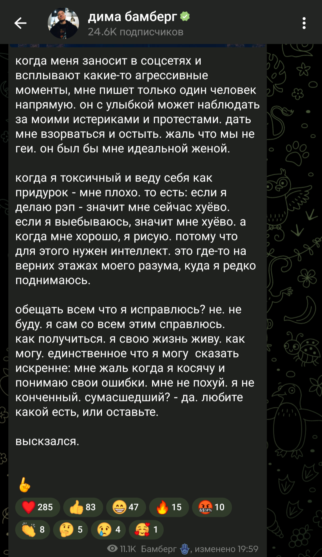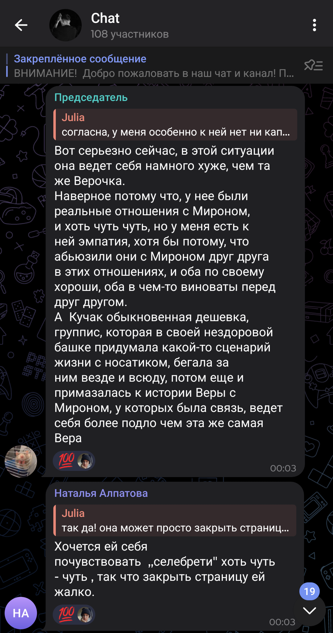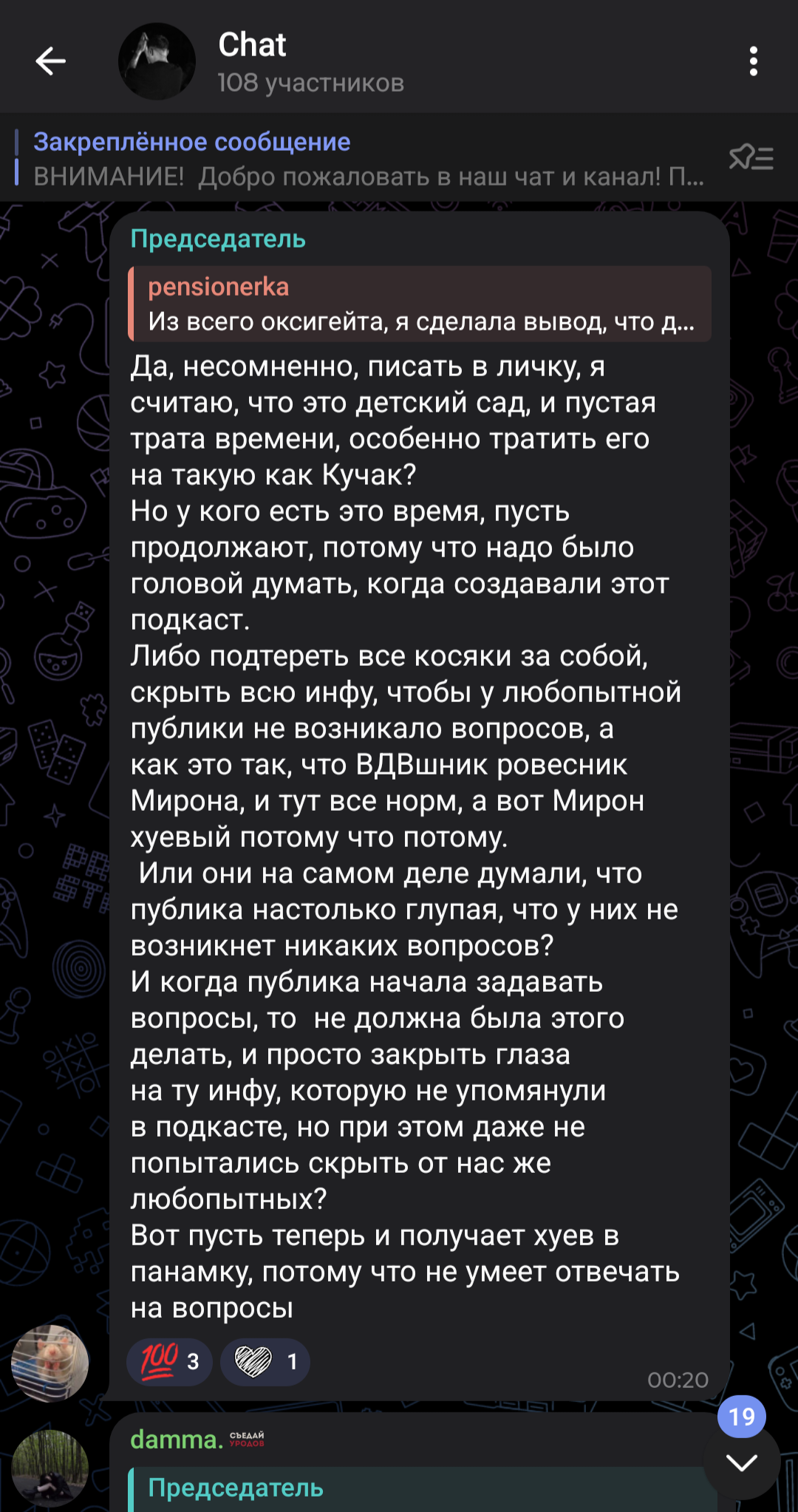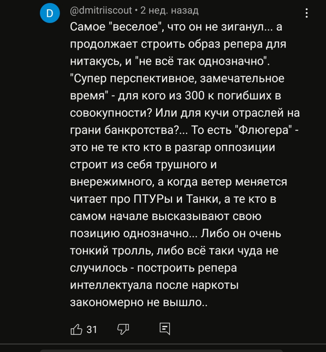 >>1013492 >>1013500 Так он собрал возле себя ему подобных ЧСВшных мразей. Эти жополизки из чата просто нашли повод сливать свою желчь на его бывших, думая, что так показывают себя умными и честными. Они обсирают радфемок и блогеров за то, что они хотят хайпа и денег на имени их любимого Мироши. Дошло до того, что они приходят к ним в комменты и начинают срач с демагогией. Прикол в том, что сами админши этого канала хотят продавать там рекламу, когда будет больше подписчиков. Типа эти деньги нужны для расследования подкаста, его организаторов и участниц. Тот же Нюберг делает аналогично. Короче, там целая смесь из лицемерия, мании и выгоды. Оксимирон в этом виноват сам: 1. Связывался с малолетками; 2. Подбирал для постоянных отношений нарциссичных мстительных сучек, желательно из богатых семей; 3. Воспитал себе подобную лояльную аудиторию, которая схавает любой его проеб; 4. Ушел в игнор и не рассказал свою версию происходящего. В общем, пустил проблему на самотек. Так что хуй с ними со всеми.
