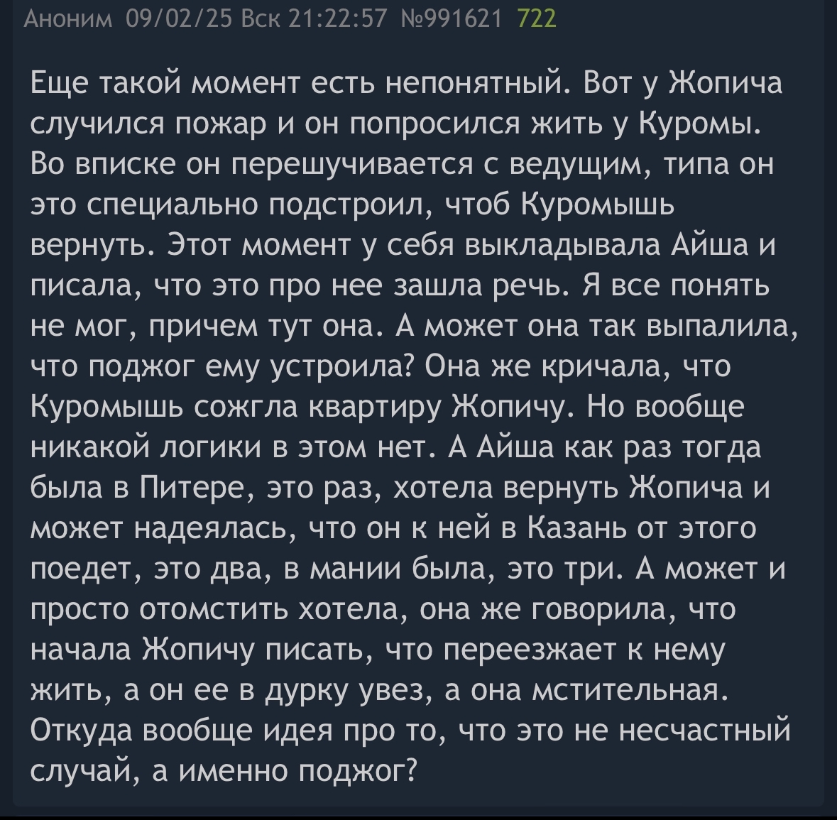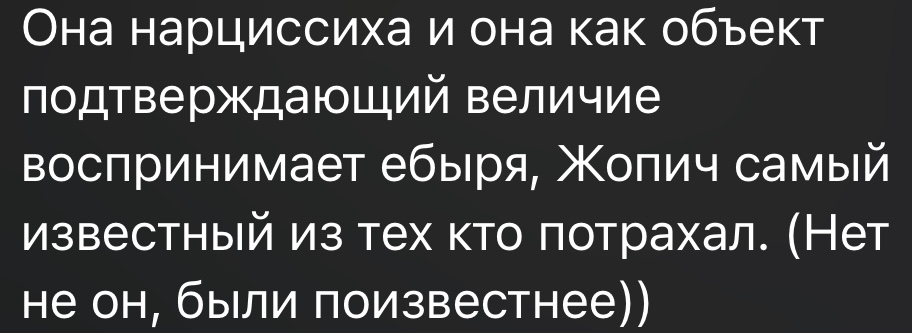 > дискотека шалава и трахалась за наркоту - хуета, ничем не подтвержденная А ты ничего странного не видишь в том, чтобы в тридцать лет отрубиться на вписке и оказаться изнасилованной? Тем более, давать за наркоту добровольно это не тоже самое, что быть изнасилованной, этого она значит не хотела. А раньше могла и не осознавать, что подобное износ тоже. > Все знакомые жопича включая тянок о ней только с теплотой вспоминают Кто о ней с теплотой упоминал? Пруфы? > Жопич сам по себе ведомый, ему мамка нужна Заметь, все эти истории со времен, когда он упарывал. Причем судя по всему сам он чисто дул, кристаллы упоминаются только в контексте Диско. А травокуры всегда неряхи и проебщики, внимание рассеянное.