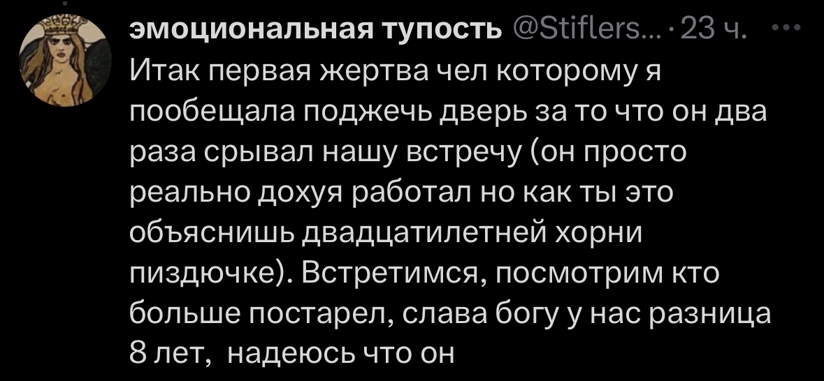 >>1015114 Я ровно наоборот помню, что она вырубилась, он ушел на баттл, а она потом на него орала, что он ее оставил с открытой дверью. А так понятно, да, на базе торча вряд ли нормальные отношения будут. Но Диско реально какая то театральная, всегда посты у нее такие «нежная мамочка» и всегда она жалуется как будто. Непонятая, непринятая. Такие люди вечно в страдании часто бывают жестокими, даже не в плане ссор, а капают на чувство вины, ноют, перекладывают на других свои проблемы. Но это чистое ИМХО.
