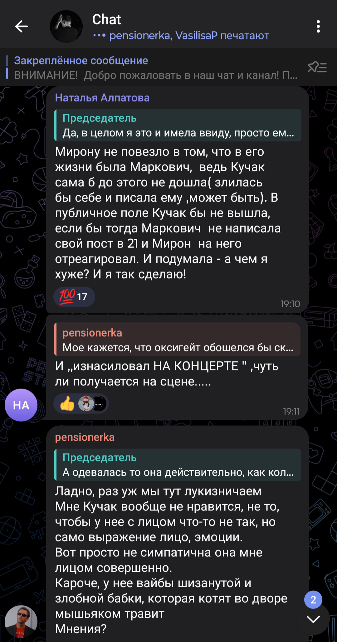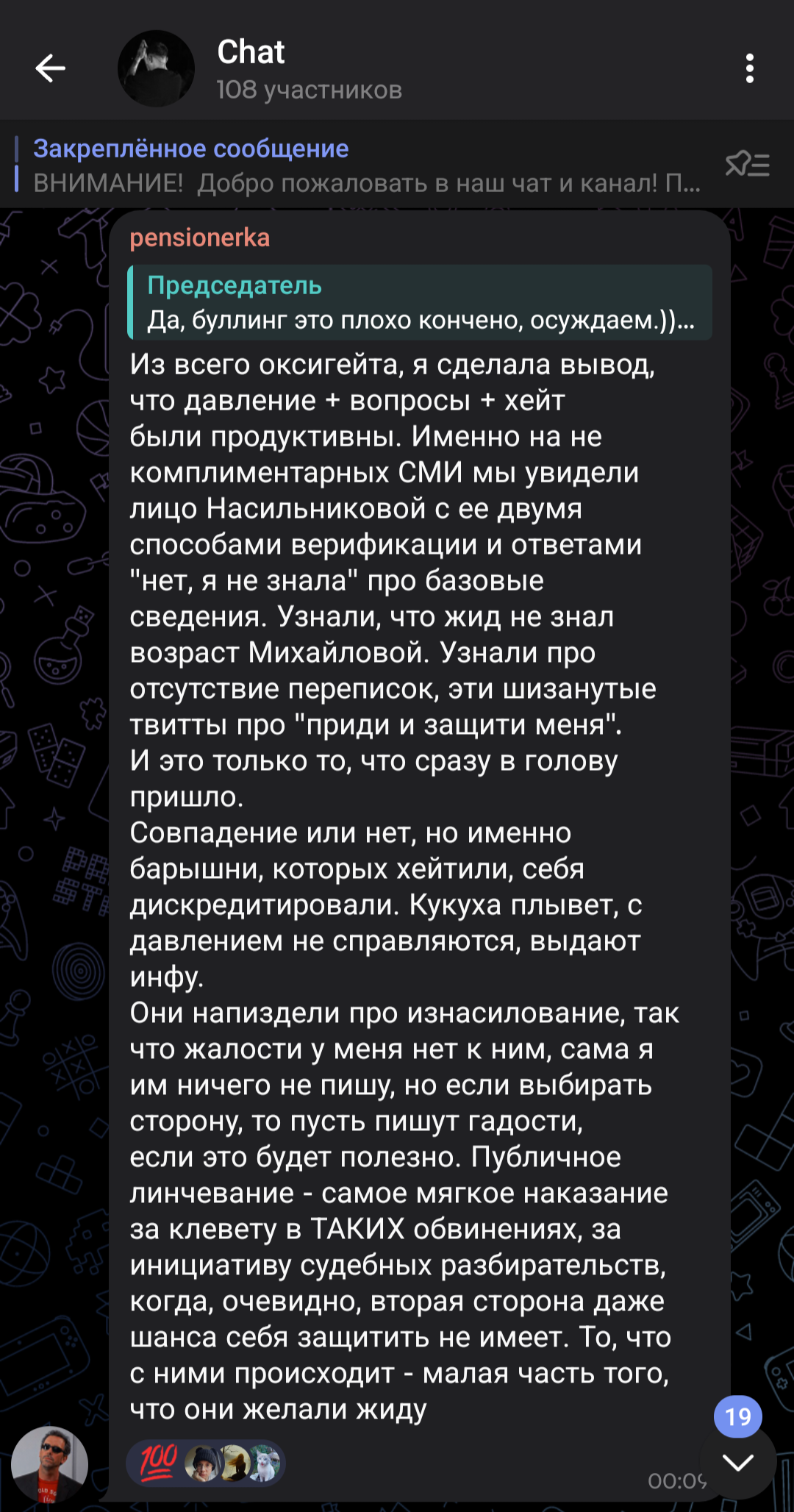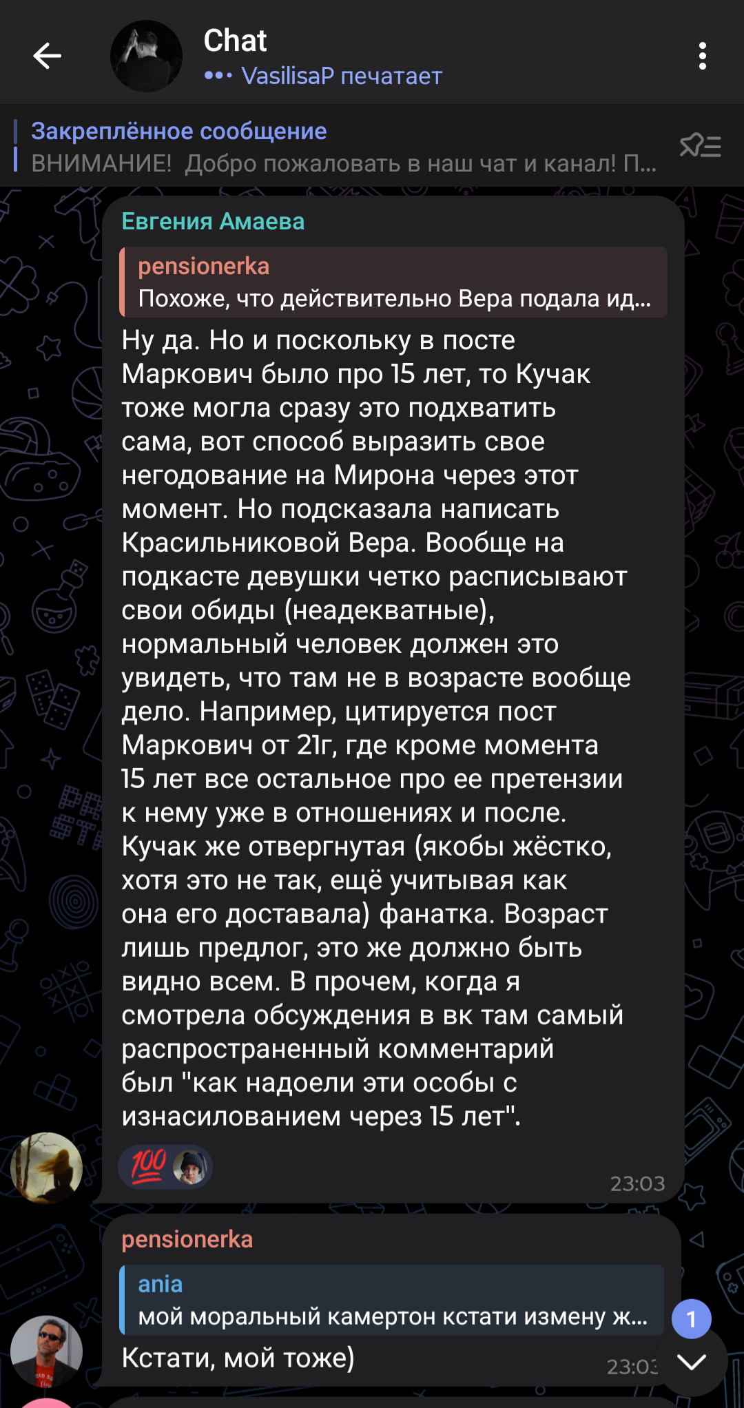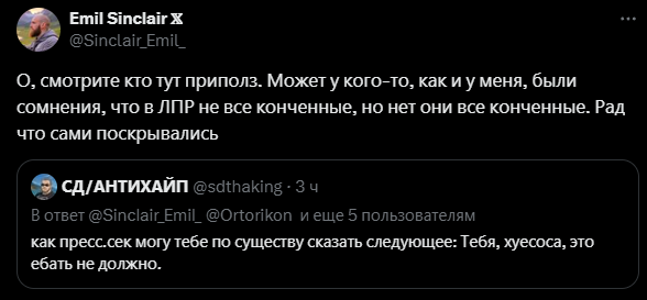 >>1015047 1. Ты ничего обо мне не знаешь, а уже навешал(-а) ярлыков; 2. До прихода этих самых шизиков из соседних тредов здесь все было адекватно; 3. Ты считаешь нормальным поведение фанаток Оксимирона? Они зазывали в свою группу под эгидой "Расследовать подкаст со всех сторон", а по итогу начали прямое оскорбление внешности и психического здоровья участниц подкаста. Эти "расследовательницы" начали лезть в личную жизнь участниц, написывать их друзьям и бывшим любовникам. Устраивали им травлю в твитторе. В чате они координировали набеги на каналы блогеров, которые встали на сторону участниц подкаста, начинали флудить и обвинять в хайпе. Неоднократно участники этой группы переходили на личности в чате, оскорбляли других участников группы, которые критиковали их и "работу расследовательниц". Хотя администраторши заявляли, что в их группе допустимо любое мнение на ситуацию. Но несмотря на это, они банили всех, кто сомневался в невиновности Оксимирона, а его ярых фанаток не банили, хотя они не соблюдали "правила" канала и многое себе позволяли. Здесь все очевидно и понятно, что они из себя представляют и для чего создавали канал.