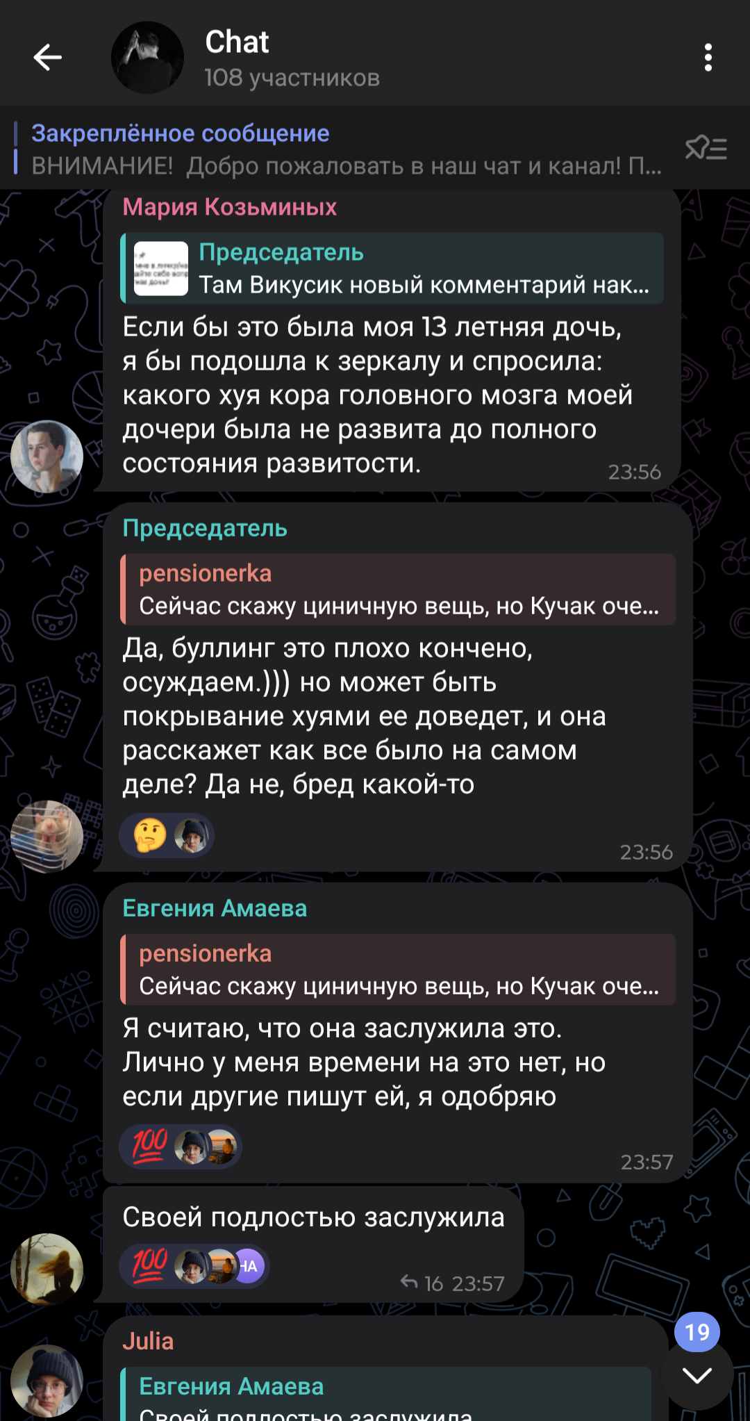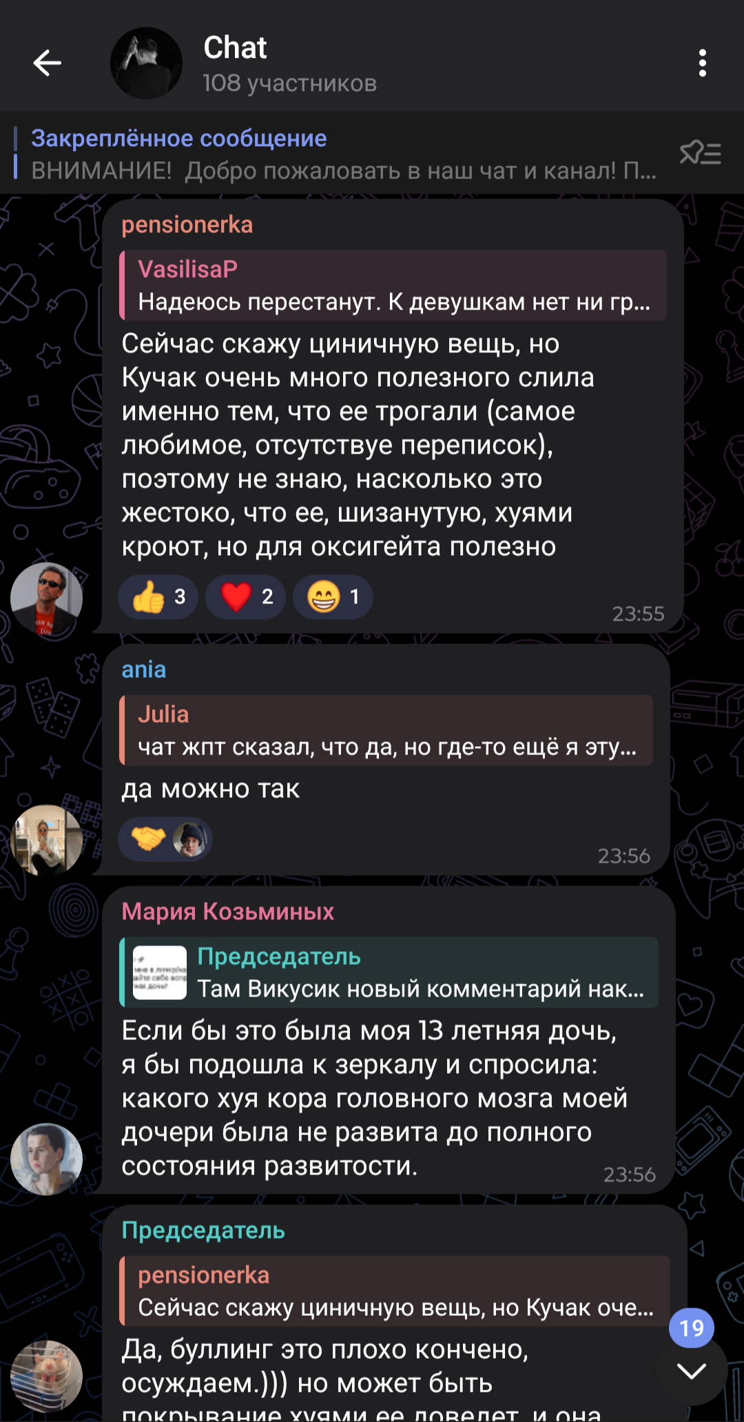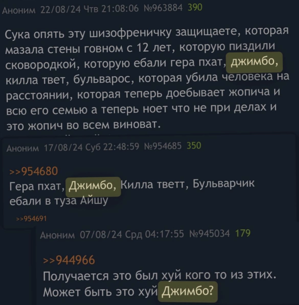 >>1015047 1. Ты ничего обо мне не знаешь, а уже навешал(-а) ярлыков; 2. До прихода этих самых шизиков из соседних тредов здесь все было адекватно; 3. Ты считаешь нормальным поведение фанаток Оксимирона? Они зазывали в свою группу под эгидой "Расследовать подкаст со всех сторон", а по итогу начали прямое оскорбление внешности и психического здоровья участниц подкаста. Эти "расследовательницы" начали лезть в личную жизнь участниц, написывать их друзьям и бывшим любовникам. Устраивали им травлю в твитторе. В чате они координировали набеги на каналы блогеров, которые встали на сторону участниц подкаста, начинали флудить и обвинять в хайпе. Неоднократно участники этой группы переходили на личности в чате, оскорбляли других участников группы, которые критиковали их и "работу расследовательниц". Хотя администраторши заявляли, что в их группе допустимо любое мнение на ситуацию. Но несмотря на это, они банили всех, кто сомневался в невиновности Оксимирона, а его ярых фанаток не банили, хотя они не соблюдали "правила" канала и многое себе позволяли. Здесь все очевидно и понятно, что они из себя представляют и для чего создавали канал.