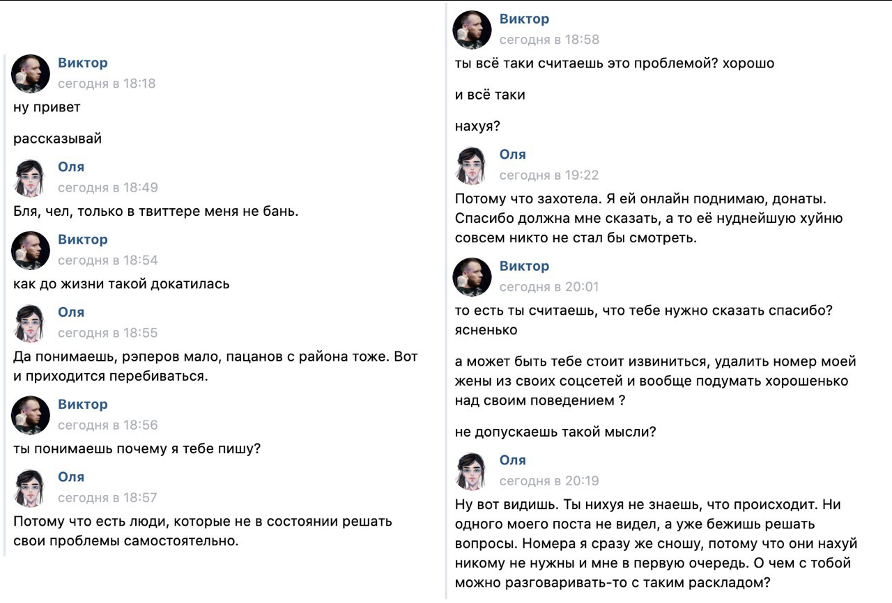 Быстро, нахуй, открыл все ссылки, которые я тебе скинула и читай, нахуй. Уёбок, блядь, хуесос конченный. Сука, из-за тебя пидораса, блядь, у Димы очко сгорело нахуй. Он меня пас с первой моей фотки раком, блядь. Он тёк по мне. Он себе искал, ждал, блядь, покорную казашку, нахуй, чтобы её ебать жёстко, нахуй. Ты даже это не мог понять, то что Дима тебя заебал этими вопросами - "что с Викой?", "как с Викой?", блядь, куколд ёбанный. Твой друг, блядь, товарищ сломал жизнь твоей бабе, нахуй. На которой ты жениться собрался, с которой ты, блядь, дом в Лондоне собрался покупать, хуесос ты ёбанный. Блядь, Мирон, какой же ты жалкий, сука! Живи, нахуй, со своей НЛОшкой обосранной. Вот ты её и достоин, два пидораса, блядь. Хватит мне жизнь, нахуй, портить. Я только, блядь, начинаю нормально жить. Только, блядь, начинаю находить нормальную работу. Ты пидорас, блядь, со своей хуйнёй ебанной, блядь, лишаешь меня всего! Лишаешь меня мужика! Лишаешь меня четвёртой работы подряд, блядь! Будь ты проклят, уёбок ёбанный, блядь. Трубку возьми, нахуй!!! Возьми трубку, хуесос обоссанный. Я от тебя, сука, не отстану. Я, сука, от тебя не отстану! Мой батя сказал, что он тебя утопит, нахуй. Понял меня, блядь?! Он тебя, блядь, якорем ёбнет и утопит тебя в лодке, хуесос блядь.