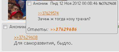 Каждый, кто в Петухах будет читать на тему "Два раза в одно место" и в Хуете на тему "Клянусь Аллахом(, я выебу тебя, дорогой брат)" подпадёт под закон "Об автоминусах", и будет ликвидирован тредовским комиссариатом.