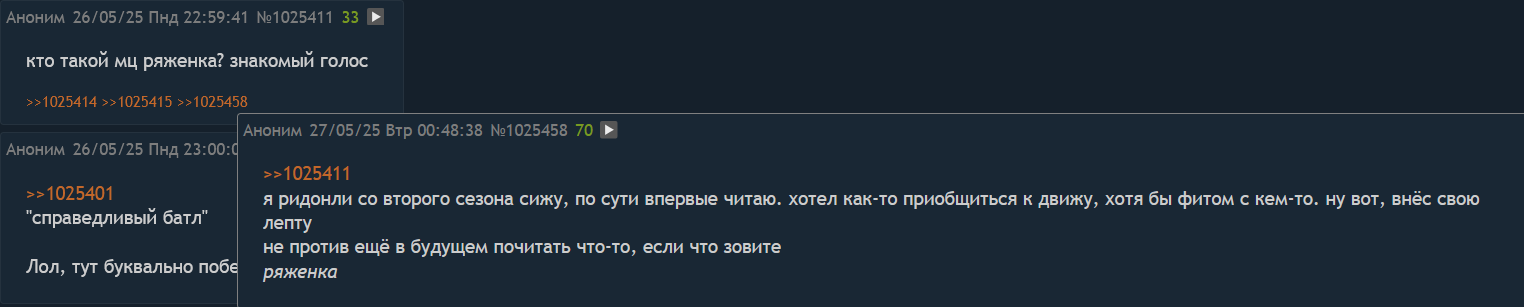 >>1034717 Чего сразу обзываешься, если кто-то считает иначе, чем ты? Качество текста у большинства прихрамывает, отдельные херовые рифмы бывают вообще у всех (даже у меня). При этом Дырочка делает грустные стихи с вайбом коммуналки, очень поэтично, очень прочувствованно, немножечко пьяно. Кто ещё может предложить подобное в рамках батла? Так, чтобы и грустно, и при этом не душно? Есть несколько узнаваемых эмси, все по-разным причинам, их слышишь и с первых строк знаешь, кто это. Дырочка один из них, за что честь и хвала.