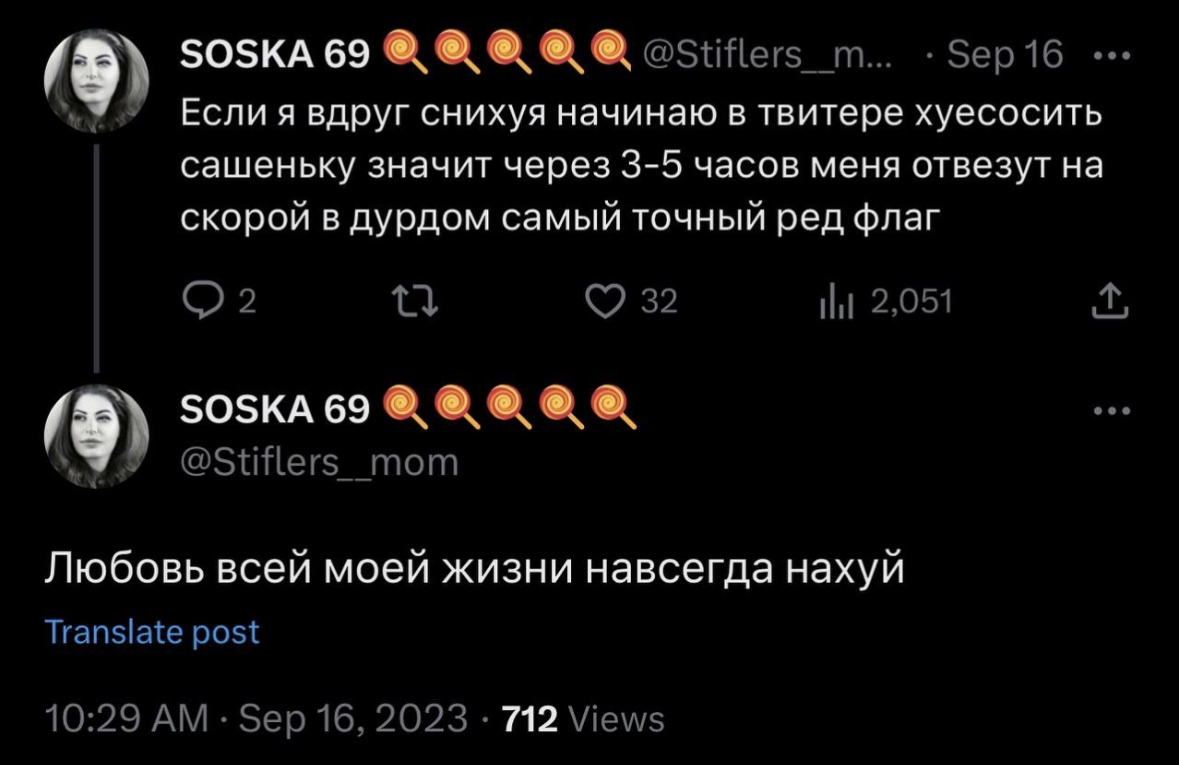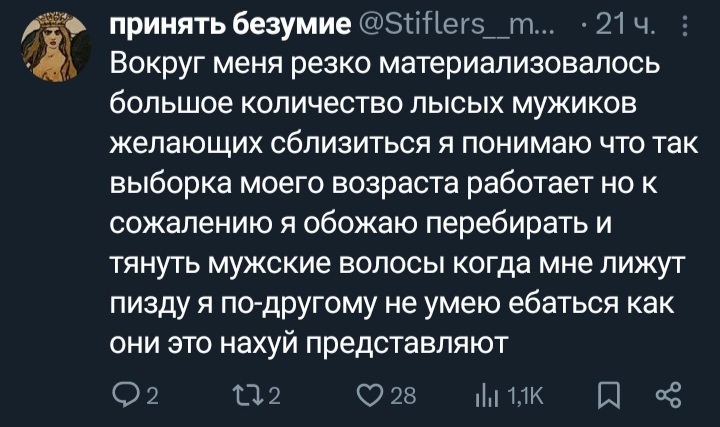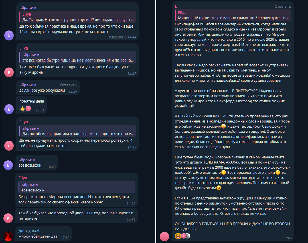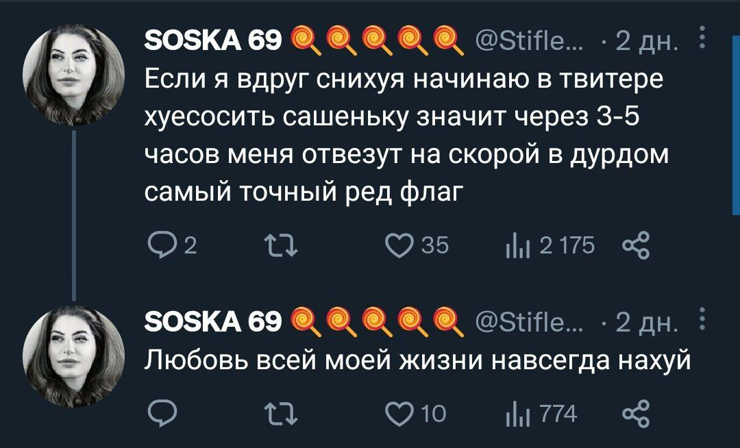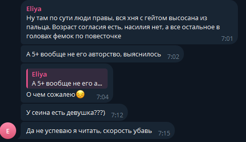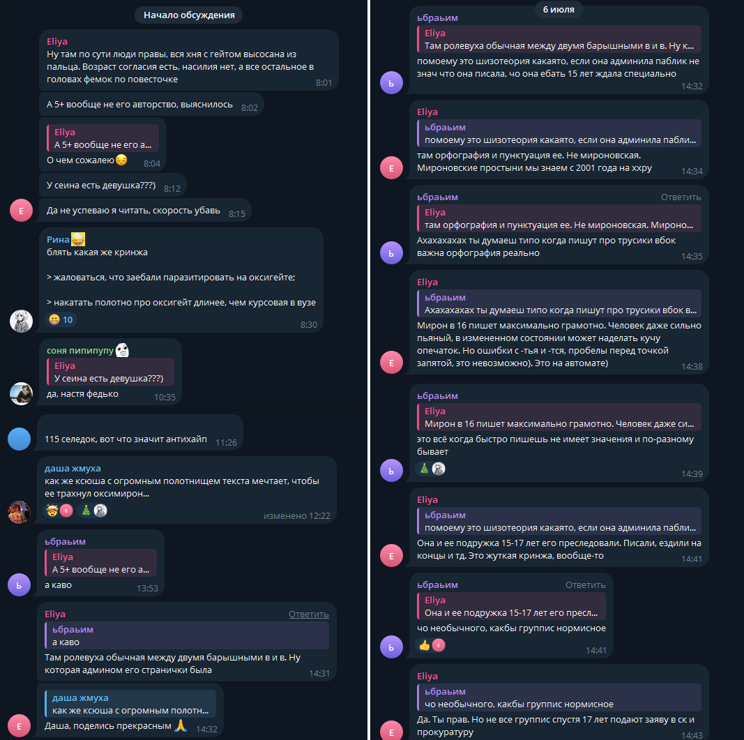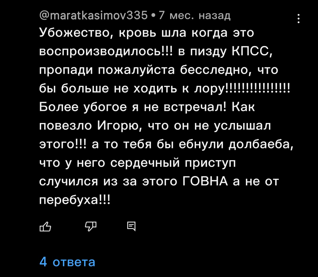 >>1039784 >>1039785 Да нихуя никто ничего не выявил. Сисы из этого тгк сами пришли к такому умозаключению, после изучения вк оксижопича и интервью с давним комментатором его стены. Они топят за то, что автор этих сообщений сама Кучак или Шокк. Никаких нормальных доказательств у них нет. И в этом вся ржомба, т. к. сисуни завели этот канал для расследования подкаста, потому что считают его притянутым за уши, а они ща быстро все докажут и разъебут подкастерок. И при этом они сами раздувают из мухи слона, фантазируют и занимаются откровенной травлей быших оксижопича. Сами пролистайте их канал и чат, там одни фантазии и домыслы, сплошные простыни бессмысленной хуйни, как-будто нейросеть писала.