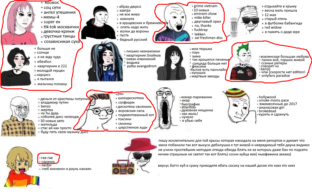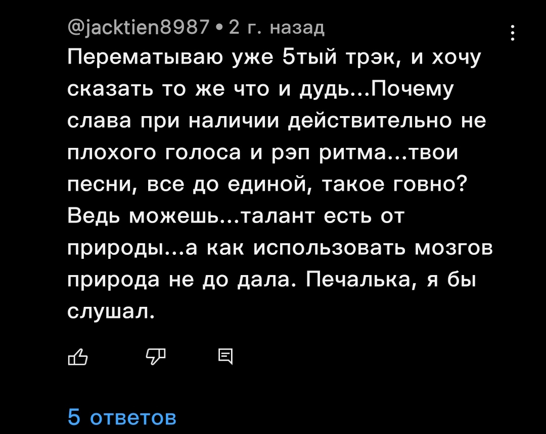 >>1039087 >дали задание на батле конкретно мочить, даже не сам версус, а весьбатл рэп Жанр не умер, а вернулся на своё место. Баттлы получили известность из-за Чмирона Хуяновича, который менял смысл жанра под себя, чтоб рекламить своё говно-творчество и стать звездой. Славка ему просто указал на дверь, т. к. его место на поэтических междусобойчиках с кацубой и полозковой. Убийца баттлов РКН, а не жопич. Смирись.