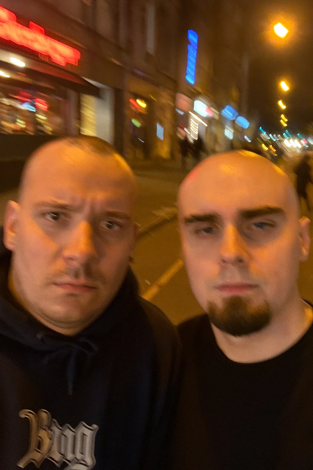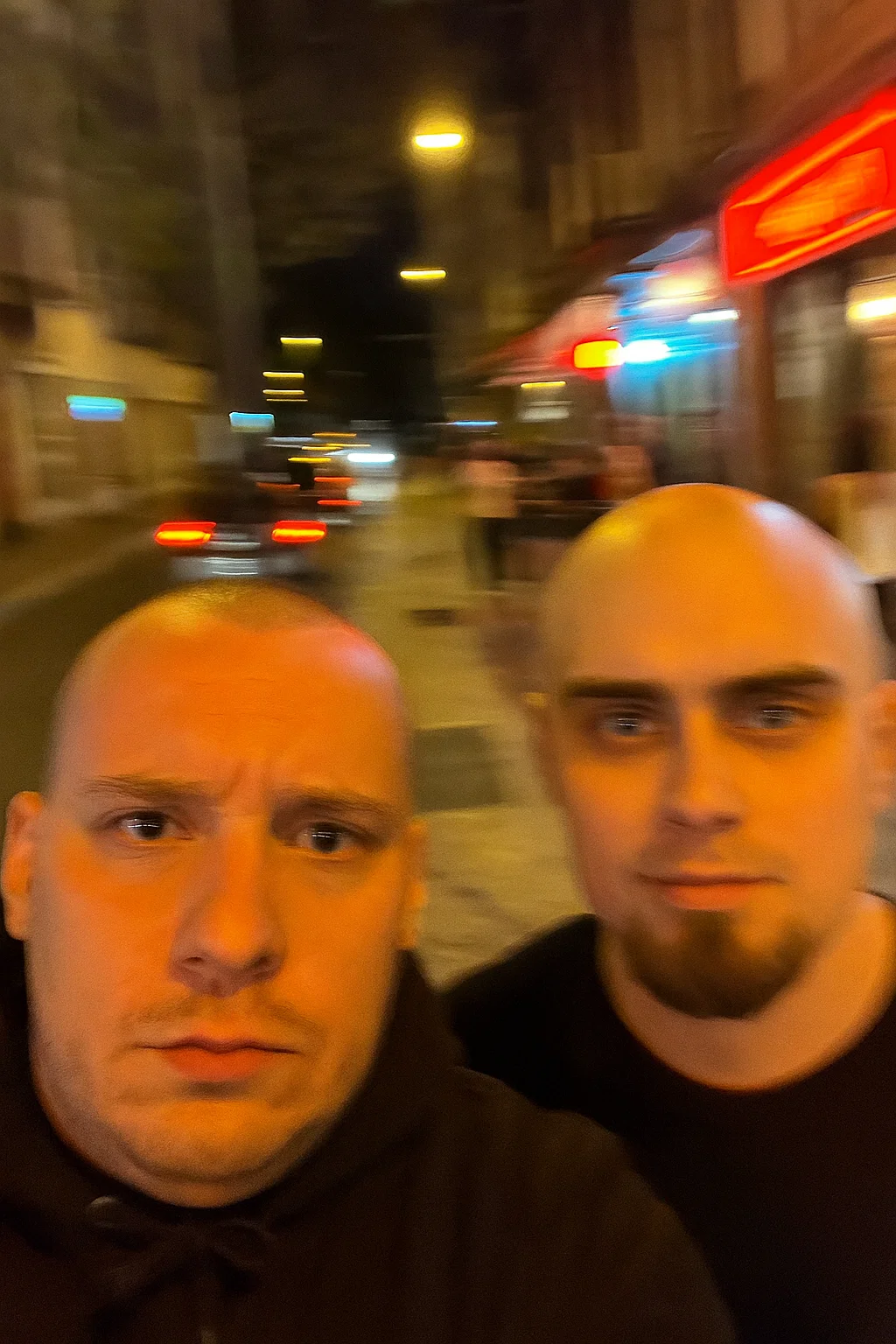 Take an extremely ordinary and unremarkable iPhone selfie, with no clear subject or sense of composition-just a quick accidental snapshot. The photo has slight motion blur and uneven lighting from streetlights or indoor lamps, causing mild overexposure in some areas. The angle is awkward and the framing is messy, giving the picture a deliberately mediocre feel, as if it was taken absentmindedly while pulling the phone from a pocket. The main character is [uploaded person's face], and [NAME] stands next to the person, both caught in a casual, imperfect moment. The background shows a lively Street at night, with neon lights, traffic, and blurry figures passing by. The overall look is intentionally plain and random, capturing the authentic vibe of a poorly composed, spontaneous iPhone selfie.