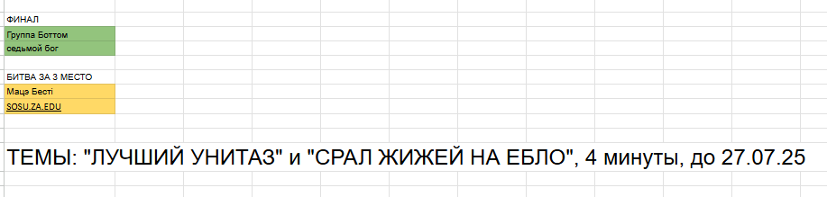 Дорогие друзья, рады Вам сообщить, что в этом раунде проходят ВСЕ участники и добавляются ребята с последнего добора - АСАВ Колядкин, Монтейг и мц уздечка! Поприветствуем малюток! К ВЕЛИКОМУ СОЖАЛЕНИЮ батол скоро закончится. Поэтому, мы объявляем финальный раунд лиги говна, в конце которого распределим ЗОЛОТО, СЕРЕБРО и БРОНЗУ лиги.