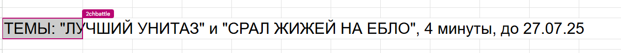 Доброй ночи, дорогие! Форма для судействм лиги говна отправлена! Всё по классике - к каждому треку можно оставить комментарий, выбираем только ТРОЙКУ лучших. Кто ещё хочет добавить себе аватарку в таблицу - отправляйте на почту, треки и текста все в меге. На всякий можете перепроверить правильная ли версия залита если пересдавали в форму. ДОБРУТРО, ШЕПЧУЩИЙ И ГАВНОМИНУС, РОДНЕНЬКИЕ, ЗА ЧТО ВЫ ТАК С НАМИ? Всем благодарность за сезон, очень много годного и интересного контента, все умницы! На днях придёт форма по реквесту зазо9с лучшими флоу/панчами/вайбом и тд, необязательная, по желанию, будет в табличке в отдельной вкладке.