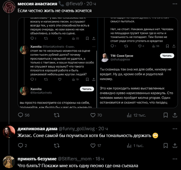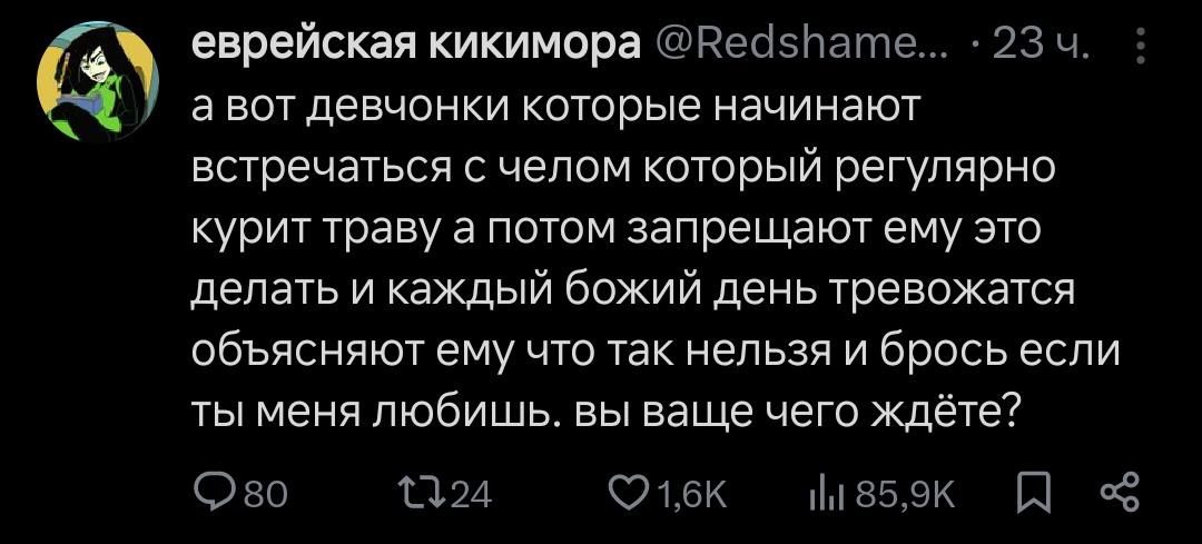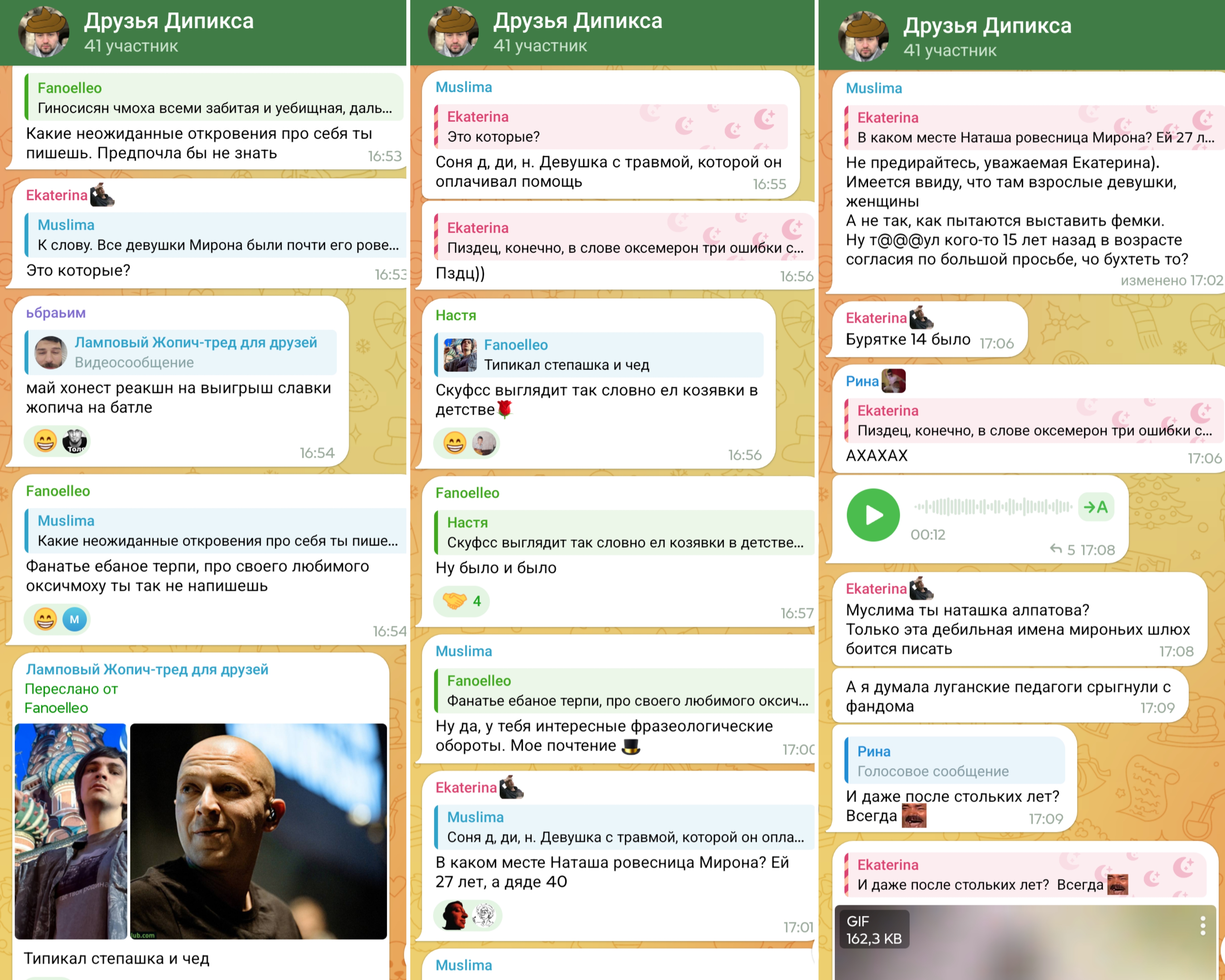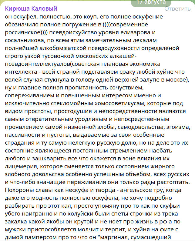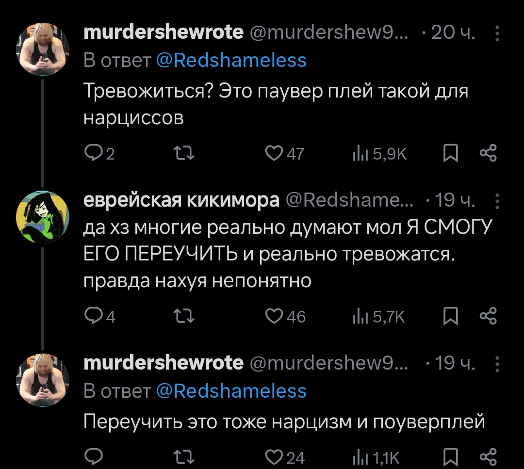>>1048270 Чел, ты сейчас буквально описал его фанаток. Я недавно смотрел профили в их тгк блядушнике, там сидят одни скуфоебки, жиpуни и рспшки. Пару тяночек есть, но они пишут как нейросеть, хз настоящие ли это люди. Воукнутый оксижопич сам себе такую аудиторию привлек, годами подмазывался к фемкам, оппозиции, либерахам. Разочарованные уже успели снова очароваться и бегают гасить эту забитую Хуйчак, богатенькая Маркович тоже все свои соцсети закрыла из-за набегов этих жиpух. Они уже даже добрались до канала Михи и дрочат там свое оксиговно. Помешательство какое-то нахуй!