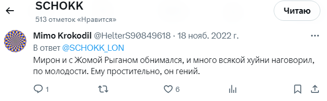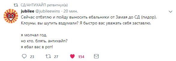 >>1047879 В видосе переписка с ним, он сразу после начала гойды какую-то соцсеть иронично прорекламил типа ЯRUS, соевая шизофанатка охуела и начала ему предъявлять за поддержку гойды и призвала к ответу, разогнала в твиторе что он гойду поддержал и продался, он жидко пукнул и все эти посты стёр