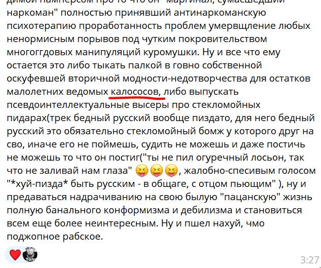 >>1047691 Тут только один мелкобуквенный опущенный калсос хохол который залетуха ебаная из фага, и калсосом я называю только его. Я хз чё это за подражатель в обычных анонах калсоса детектит