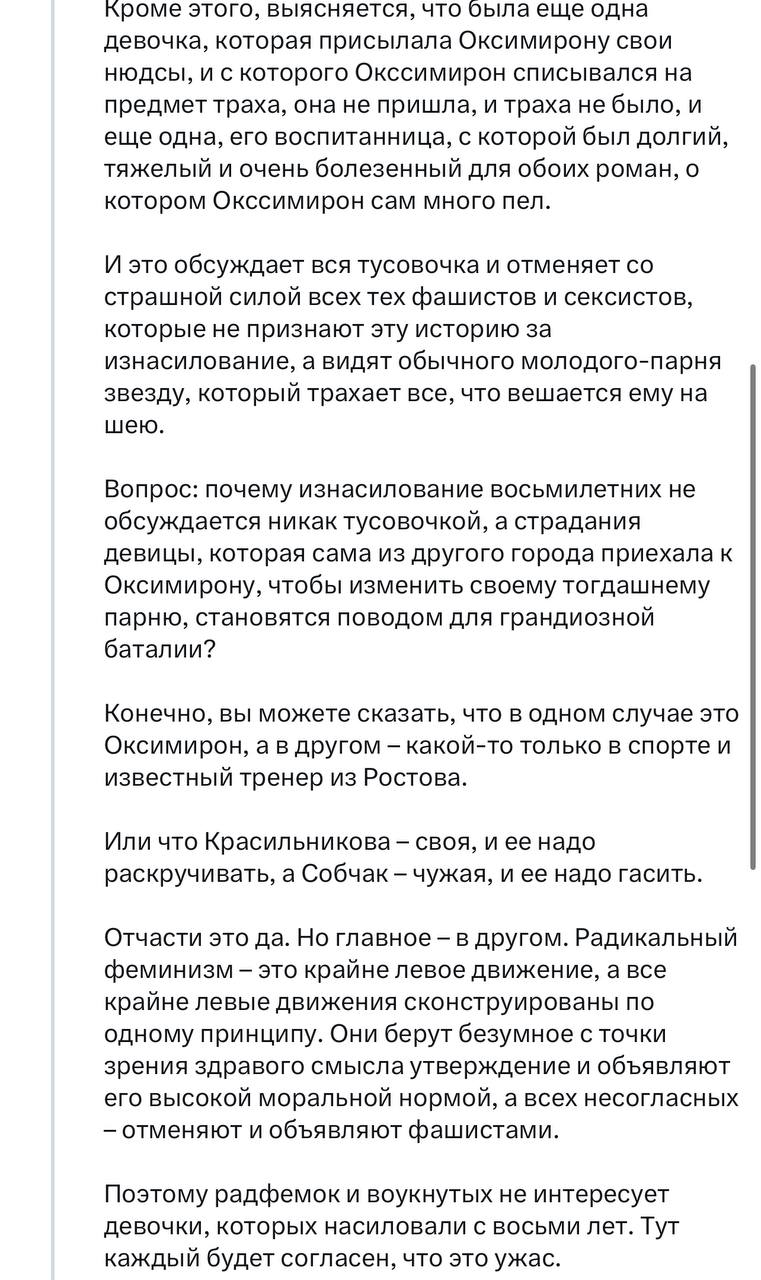 >>1048191 >>1048167 Они обе упускают момент,что до тех пор пока Осижопич не стал иконой тех самых воукнутых горения не было. Он сам создал десять минут нытья, как тяжело оправиться от леща за мамоебские песни. Пришлось аж Жигану нализывать десять лет. Ты мне ничего не сделаешь, вот это мужык. Понятно, что раз тебе так тяжело одну пощечину перенести, то те кого ты в малолетстве ебал считают свою травму посерьезнее. И то что и одно и другое высосано из пальца похуй, он сам эту шарманку завел.