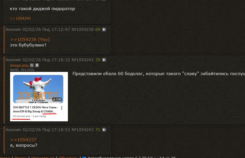 Регламент: Тот же самый что и в прошлый раз. Сдача треков происходит путём загрузки файла трека по форме (в оп посте для отбора, в остальных раундах форма будет приходить на почту участника). Также если очень не хочется палить фейкомыло трек можно сдать в тред с каким либо пруфом который подтвердит твою личность, например огромный самотык с автографами Альбины Сексовой и Стаса Барецкого, хуй знает. Просто кидаете пруф, ссылку на трек и свой ник. В следующих тредах при выставлении оценок и сдаче следующих треков нужно будет также использовать ПРУФ КАК ПРУФ. Для каждого раунда определена тема (или несколько тем, в таком случае достаточно раскрыть лишь одну тему на выбор) и ограничение по длине трека (можно незначительно превысить на 10 или 20 секунд если прям совсем нужно, но не наглеть). Батл одиночный, не командный. Для всех должно быть очевидно что на треке участвует один человек. Начиная с парных раундов разрешены гостевые участники для бэков, припевов и прочей подобной лабуды. При этом гость должен занимать меньше четверти трека относительно участника батла. Леваки сдавать запрещено, определяются путём несоответствия трека теме раунда. Виртуалы (участие в батле под несколькими разными никами) запрещены. При раскрытии виртуала участник будет дисквалифицирован вместе со всеми раскрытыми виртуалами. На одного человека только один трек. Никаких СуноБотов. Исполнять должны вы. ВойсМорфер использовать можно. Первый раунд — отборочный, остальные парные. В парных раундах в каждой паре будет только один победитель, который пройдёт в следующий раунд. Пары будут распределяться случайным образом без подкруток.