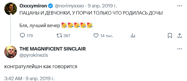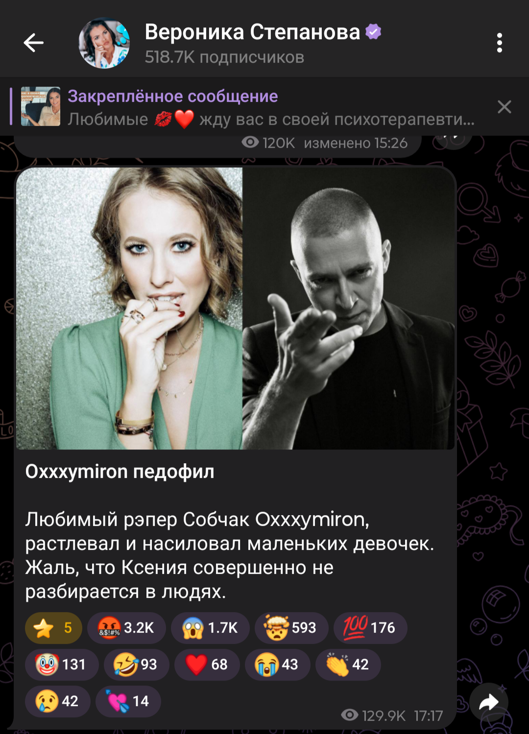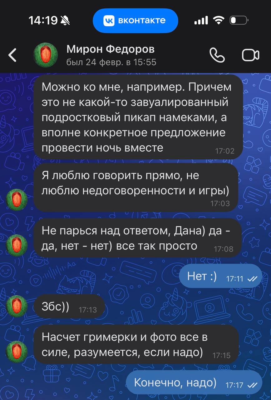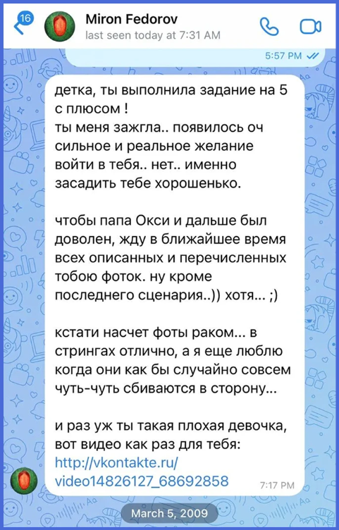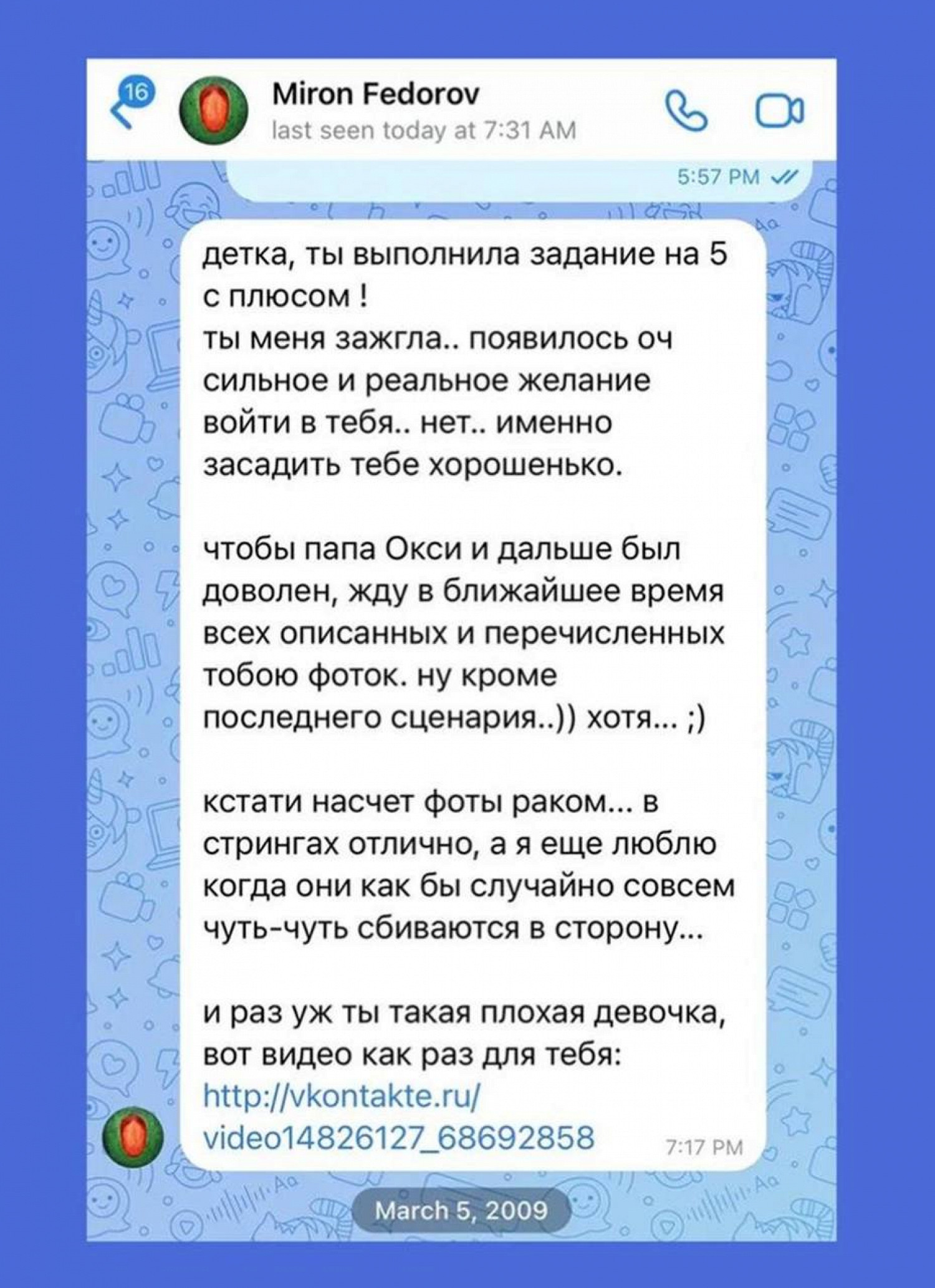 И ни 1 пруфа вика кучак не принесла, что папа окси лично ей что-то пошлое писал в личку, а они общались ТРИ ГОДА. и якобы он ПРИСЫЛАЛ ПОРНУХУ и всякте пошлые реквесты делал.