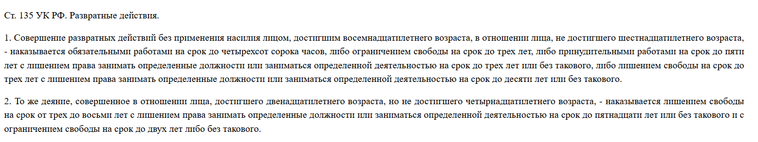 >>997852 За срок давности не скажу, может, по этим случаям уже и не привлечь действительно (хотя закон что дышло: куда повернул - туда и вышло) Но состав преступления был ещё до того, как случилось сексуализированное насилие. 13летке слать развратные вещи и порно - это тоже статья
