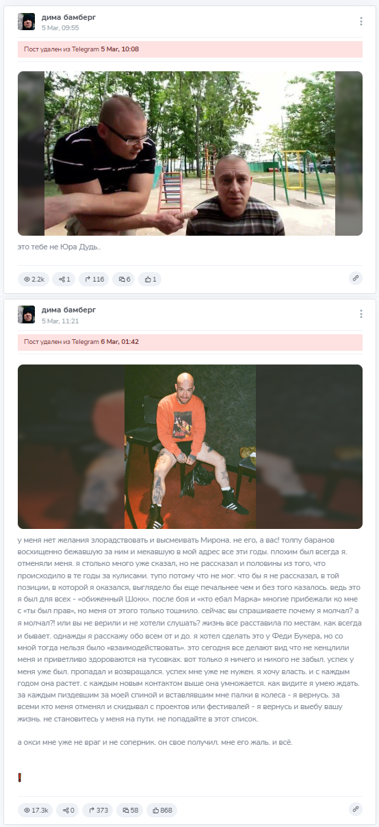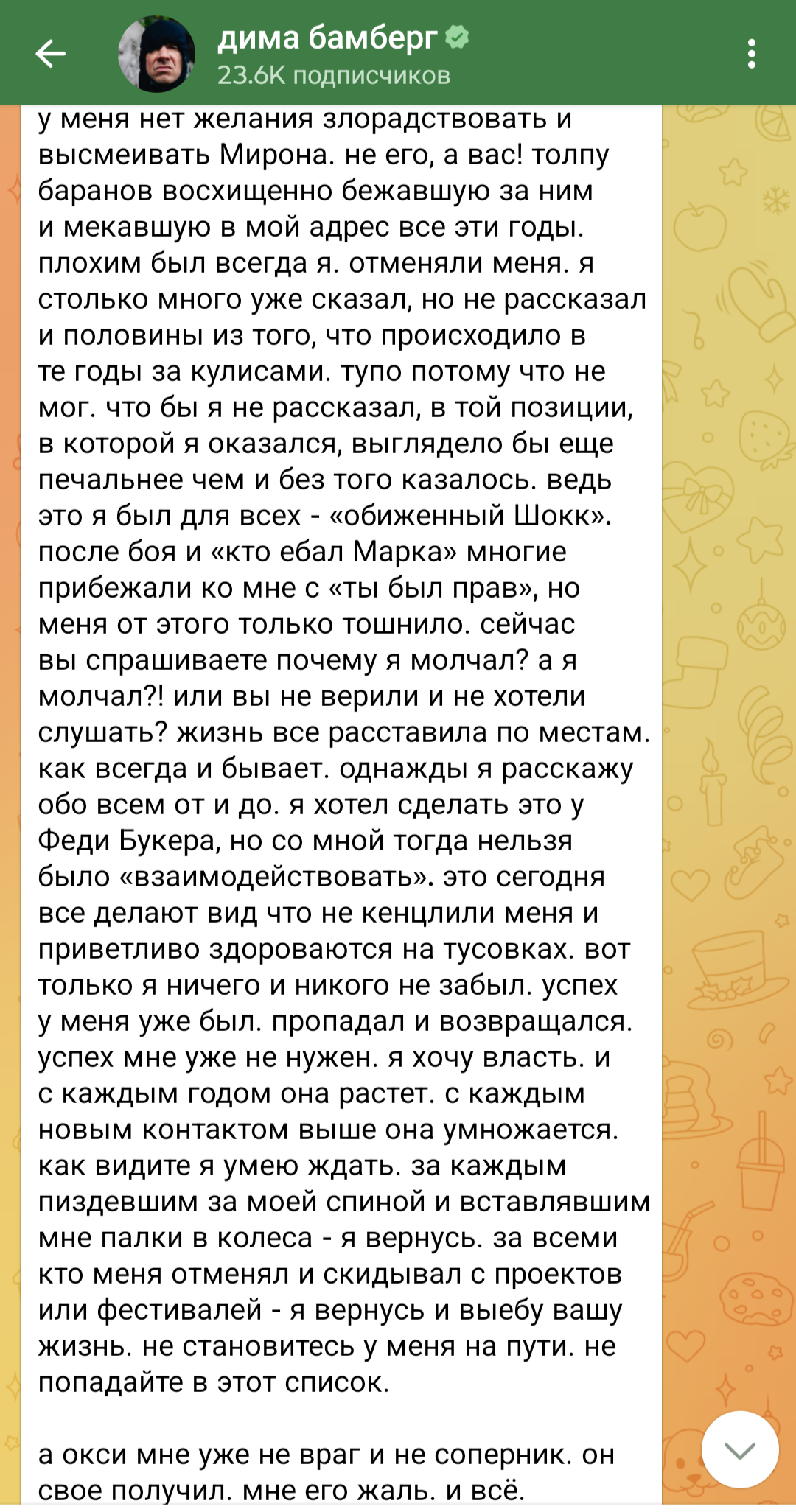 Просто смешно с того, как распетушился бамберг. "А я говорил! А я говорил!". Когда ты блять начал говорить, когда вы разругались в пух и прах? То есть до жигана Диму все устраивало в поведении оксика? Видимо, после пиздюлей у бамберга что-то щелкнуло в голове и он такой: "Ну, оксимирон плохой, он ебал малолеток", а до этих самых пиздюлей они были лучшими подругами и димона все устраивало. Двуличие, оно такое