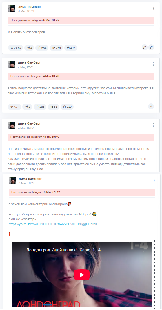 Тот же мужик в 26 лет начинает с ней встречаться, параллельно пишет 13-летней школьнице из казахстанского посёлка. Будучи в отношениях, 3 года ведёт переписки с несовершеннолетней и не достигшей возраста сексуального согласия школьницей. В 16 лет на концерте точно-точно уточняет, что ей 16, и насилует. После этого кидает в чс.
