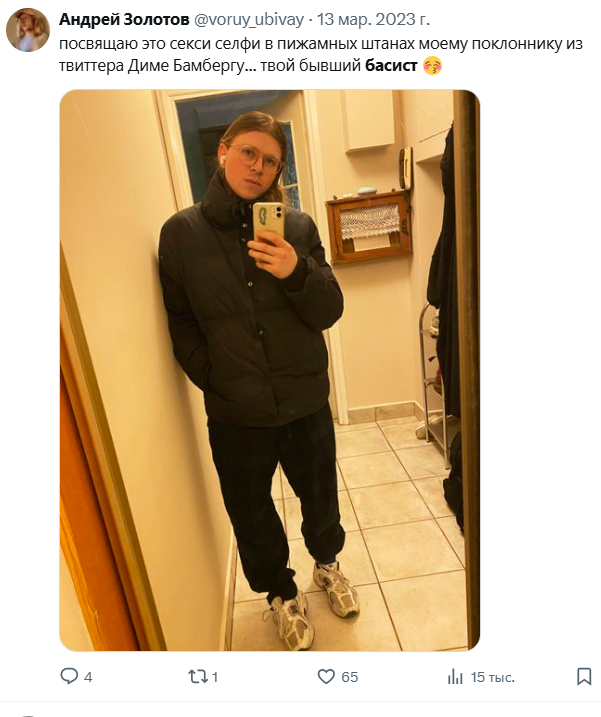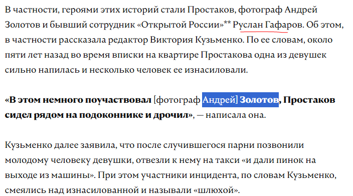 >>998717 > а рядом сидел журналист Простаков на подоконнике и дрочил Я помню эту историю, ща загуглил и оказалось, что там в изнасиловании, на которое дрочил некий простаков, якобы участвовал фотограф Андрей Золотов, которого Бамберг называл басистом своей группы и стебал за соевость. А еще в статье упоминается другая типичная твитор история про насилие, где виновник - некий твиторский Гафаров, так вот. Ему до этого дали в ебло и избили ногами ныне покойные Саша Скул и Murda Killa. https://cont.ws/@eugenyantonov/1456093