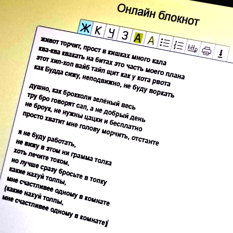Баратравля ЗалутХХа Кривой Картон Мая Ковская абдулах стекломой шиз Monteig BEZRAB Группа Боттом Настя Шмаравозова Ветер 40 м/с ТИМОХАБРАТАН1995 гераHz (текст не нашел, нихуя не понял) bru_h cumtora Lo6ster DEVIN Оранжевый смех Шепчущий Во Тьме КАЗАХ НА ТОРМОЗАХ МС Шнопак (интересный перфоманс, осталось только текст в мегу залить) Мертвый Гагарин НейроБоб Утконос Creme de la penis