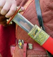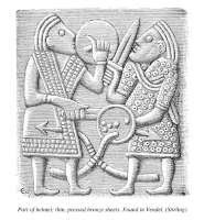 >>876510 "В одной из могил Вальсгерде (могила 8) вместе с одним из этих великолепных шлемов и другой военной добычей обнаружили деревянный ящик, содержащий 21 перекладину или планку из железа, каждая из которых хранила следы того, что некогда они были соединены и образовывали три предмета, два длинных и один короткий. При этом отдельные планки скрепляли пересекающиеся ремешки на заклёпках." На тонких концах самые короткие планки украшены условно выполненными головками животных, выдававшими их скандинавское происхождение. С одного конца все они присоединялись к фрагментам кольчужного полотна"... ...."Затем, как это обычно и происходит в таких случаях, в книгах о них было написано немало нелепостей, но был наконец получен результат, надёжно подтверждённый рисованными свидетельствами того периода. Теперь можно с определённой уверенностью сказать, что длинные планки "собирались" в пару наголенников с дополнением в виде носка или чехла из кольчужного полотна, призванного защищать подъём ноги. Короткие же образовывали манжету единственной кольчужной перчатки"... ...."Защитные приспособления похожего типа находили в нескольких скифских могилах, датировавшихся приблизительно 400 годом до нашей эры. Наголенники не составляют пары, поскольку они разных размеров, но метод крепления кольчуги в обоих случаях различается. Таким образом, по видимому, здесь, как и во многих других случаях, мы имеем дело с оружием уже достаточно древним, получившим некоторые повреждения до того времени, как его опустили в могилу"...... ...."Почему при этом туда положили различные наголенники - это загадка, которую вряд ли удастся разгадать. Возможно, что под рукой просто вовремя не оказалось двух подходящих". Эварт Окшотт(Археология оружия).