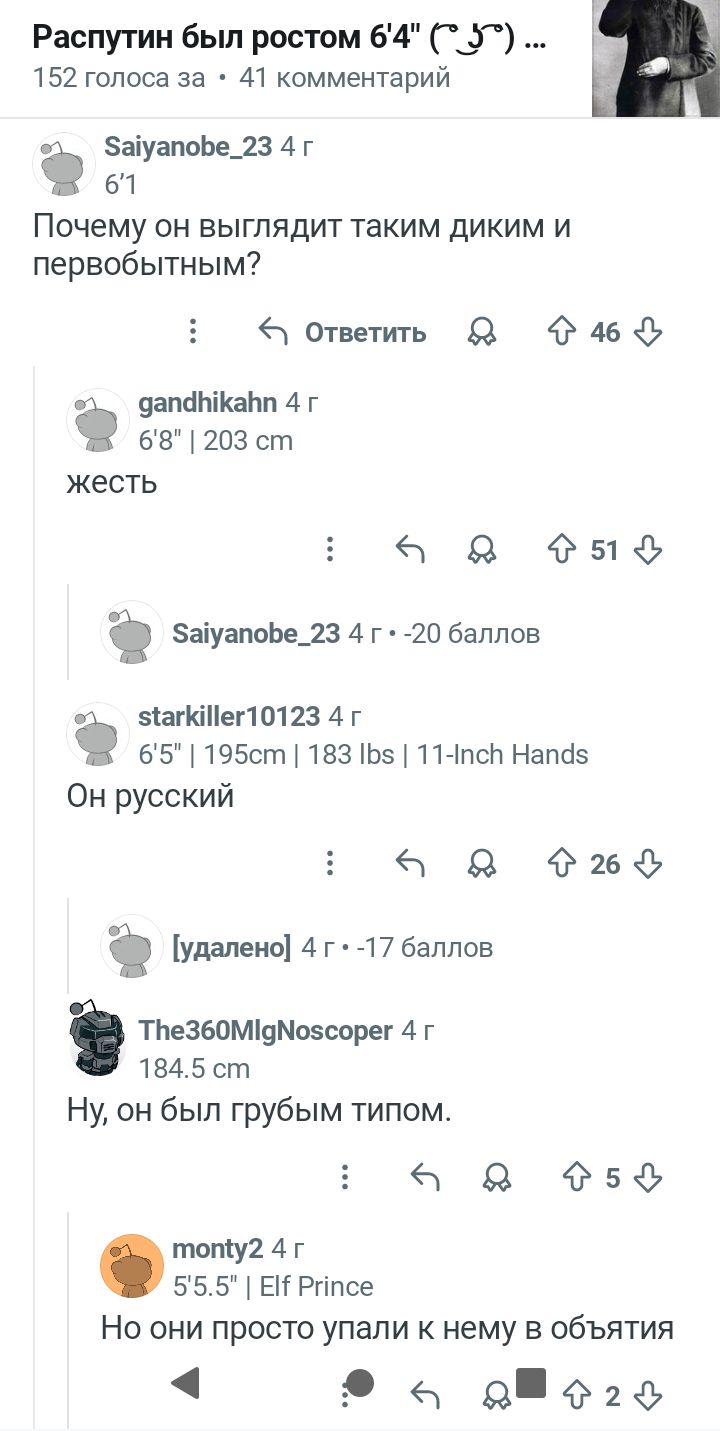 >>1009117 Видно, что Распутин на фото выше большей части мужчин, в Википедии в статье "Рост человека" со ссылкой на работы NCD Risk Factor Collaboration утверждается, что средний рост мужчины в РИ в 1914-м году составлял 167 см, Распутин не мог бы быть среднего роста и при этом на треть головы ниже императрицы.