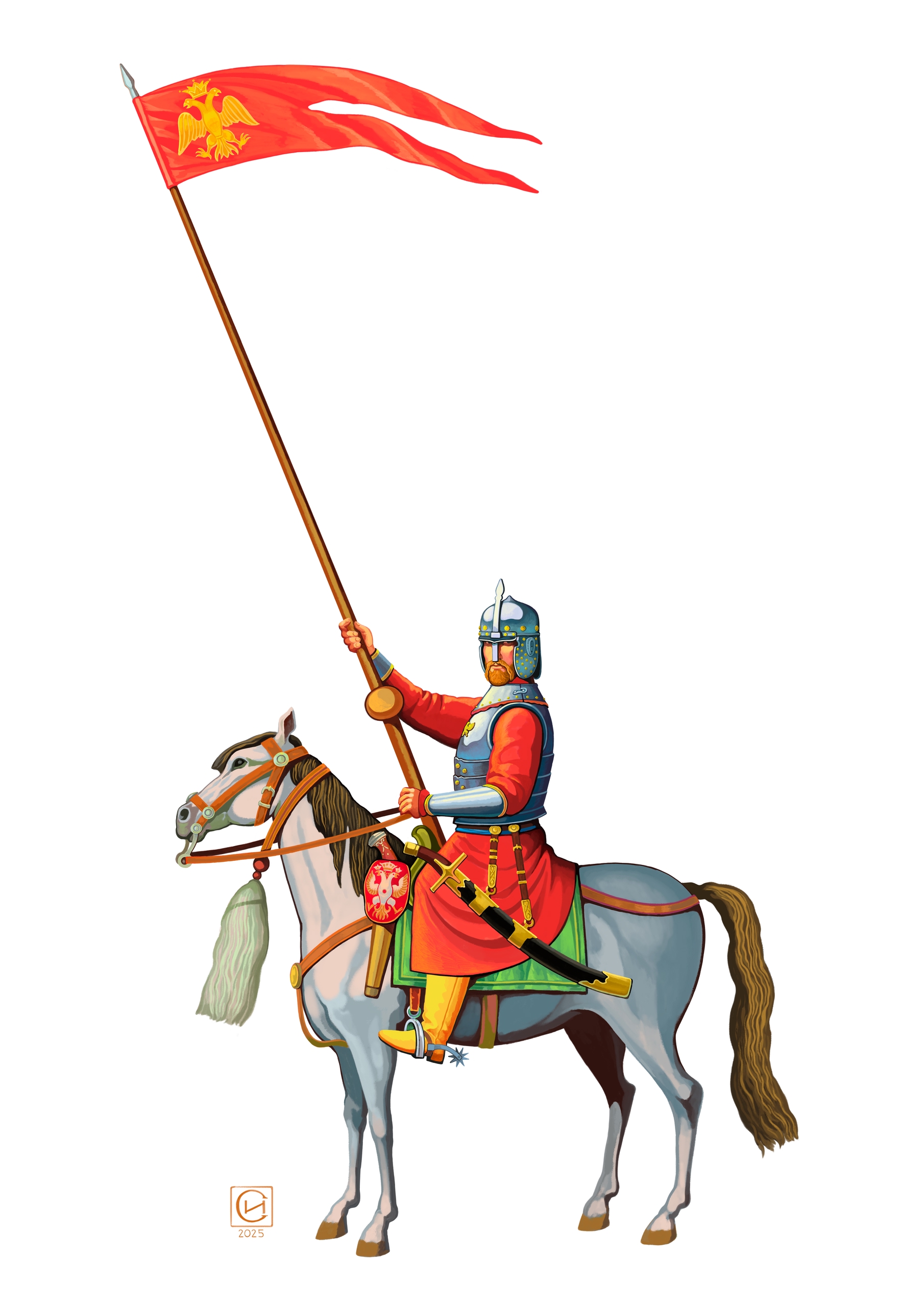 Этот новгородский боярин входит в состав Владычного полка новгородского архиепископа (из числа новгородской кованой рати). Поэтому у него на щите нарисован православный Патриарший Крест, как религиозный символ этого воинского подразделения.