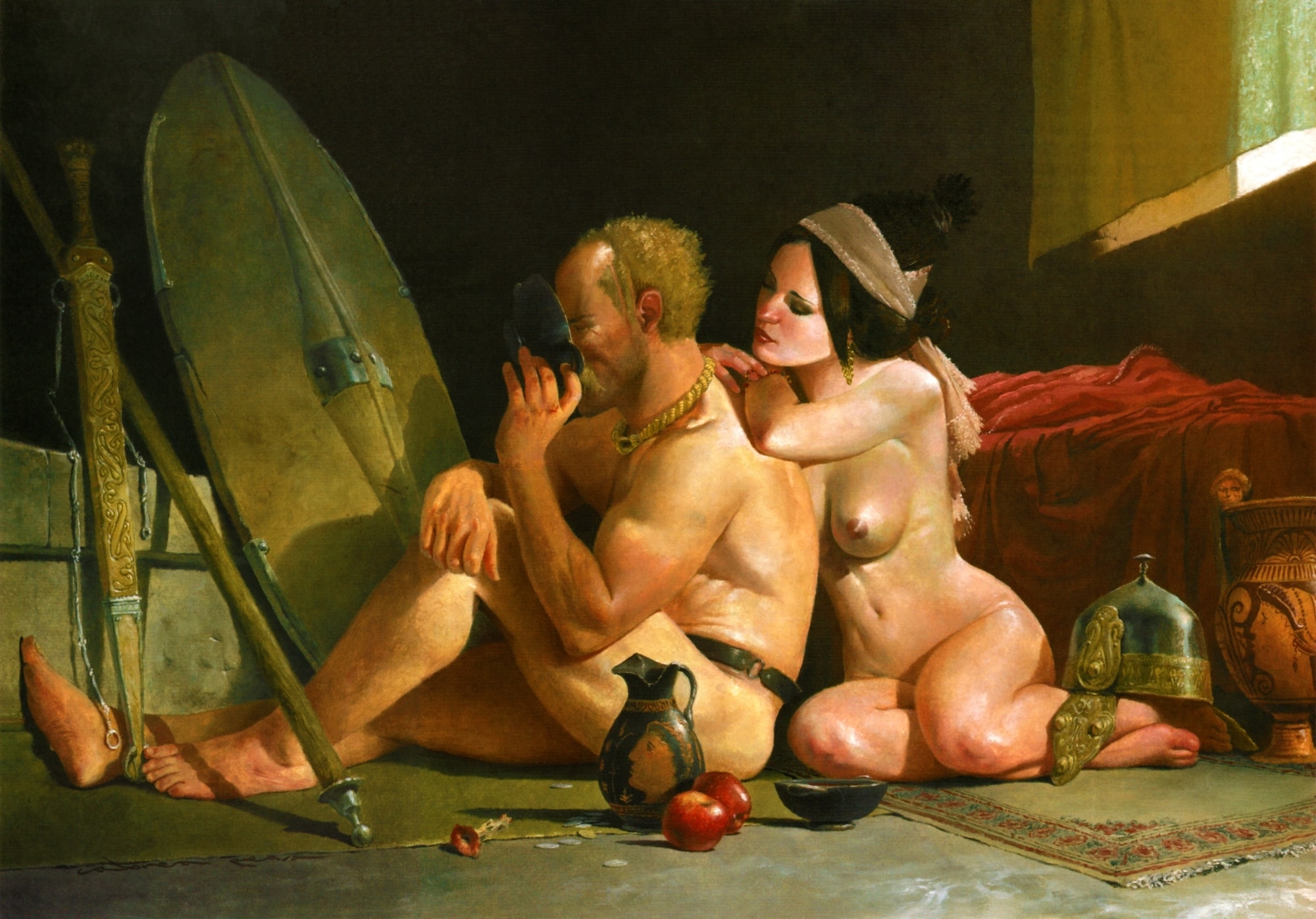 >>1019138 "44. (1) В том легионе было два очень храбрых центуриона, которым немного оставалось до повышения в первый ранг: Т. Пулион и Л. Ворен. (2) Между ними был постоянный спор о том, кто из них заслуживает предпочтения, и из года в год они боролись за повышение с величайшим соревнованием. (3) Когда около укреплений шел ожесточенный бой, Пулион сказал: чего ж ты раздумываешь, Ворен? и какого другого случая ждешь показать свою храбрость? Нынешний день порешит наш спор. (4) С этими словами он вышел из-за укрепления и бросился на неприятелей там, где они были особенно скучены. (5) Ворен тоже не остался за валом, но, боясь общественного мнения, пошел за ним. (6) Тогда Пулион, подойдя на близкое расстояние к врагу, пустил копье и пронзил им одного галла, выбежавшего вперед из толпы. Враги прикрыли щитами своего пораженного и бездыханного товарища и все до одного стали стрелять в Пулиона, не давая ему возможности двинуться с места. (7) Пулиону пробили щит, и один дротик попал в перевязь. (8) Этим ударом были отброшены назад ножны и задержана его правая рука, когда он пытался вытащить меч. Тогда враги, пользуясь его затруднением, обступили его. (9) Но тут подбежал его соперник Ворен и подал ему в эту трудную минуту помощь. (10) Вся толпа тотчас же обратилась на него и бросила Пулиона, думая, что он убит дротиком. (11) Ворен действует мечом и, убив одного, мало-помалу заставляет остальных отступить; (12) но в увлечении преследованием он попадает в яму и падает. (13) Теперь и он в свою очередь окружен, но ему приходит на помощь Пулион, и оба, убив немало неприятелей, благополучно, со славой возвращаются в лагерь. (14) Так подшутила над ними судьба в их соперничестве и борьбе: оба врага поддержали и выручили друг друга, и нельзя было решить, кого из них следует признать храбрей другого".