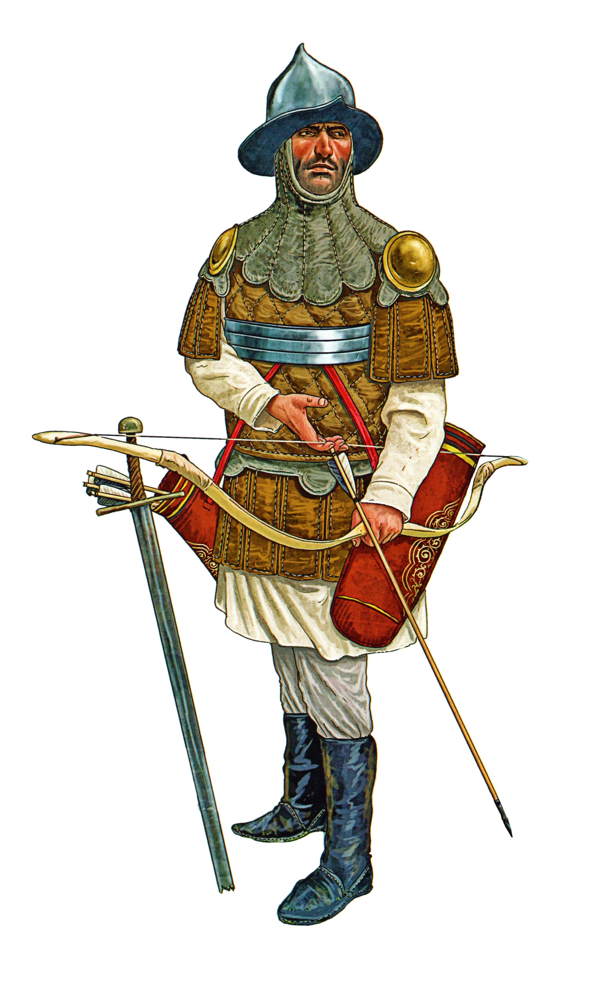 >>1023729 На Руси никогда не носили византийские лорики с птеригами. И европейские доспехи в 14 веке тоже никакие не носили. Доспех тяжелого русича 10-16 веков это короткая кольчужка и открытый сфероконический шелом с бармицей. У самых знатных бояр и князей еще ламеллярная/чешуйчатая безрукавка, или бахтерец в 16 веке, и наручи. Всё. Русский доспех всегда был самым убогим и неполным по сравнению с доспехами Европы и даже Востока.
