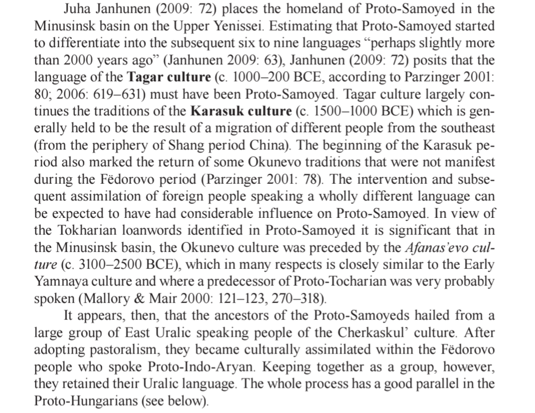 >>1020616 Археологические культуры не обязательно гомогенны по составу. Просто потому что в исследованиях опубликованы генотипы скифских элит этой культуры, не означает, что на ее территории жили только индоевропейцы. Обособление самоедов как самостоятельной языковой группы и их переход к скотоводческого образу жизни скорее всего происходили параллельно с индоиранской экспансией в Сибирь. Самоеды, соответственно, вобрали себя и это новое андроновское влияние, но также сохранили окуневские элементы (которые в археологии и палеогенетике Андронова не отразилось вообще), и даже более ранний (тохаркий) субстрат от афанасьевцев. Роды (r1aды?) тагарцев со временем утратили свою роль в Сибири, частично, если не преимущественно, откочевалв в любом из направлений Великой степи, в то время как местные n1c самоеды никуда не делись. Ну, по крайней мере, пока не отюречились и омонголились в Средние века