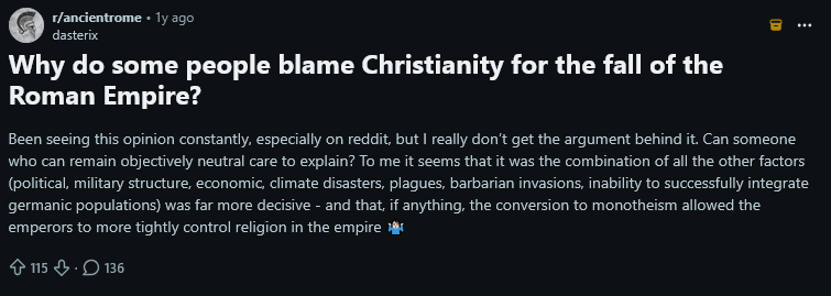 >>1022858 Так это популярная среди порвачков теория заговора о том что Римскую империю христиане развалили. Только вот каким образом? Западная пала под натиском варваров и всяких эпидемий. Восточная еще долго существовала и была христианской.