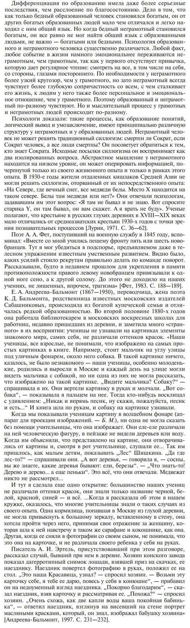 Нужно читать статью "Познавательные способности русских крестьян доиндустриальной эпохи" Б.Н.Миронова.