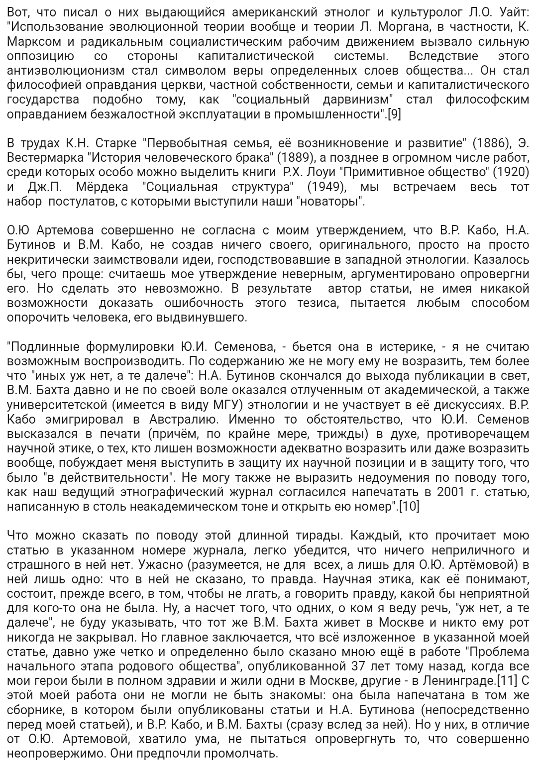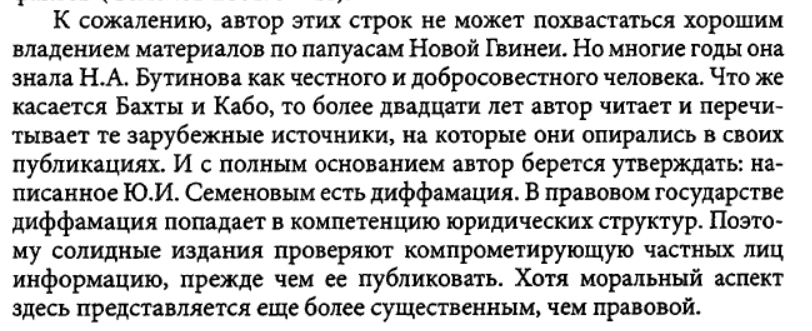 Наиболее воинственным и изощренным борцом с научным прогрессом был Юрий Иванович Семенов. Философ-истматчик из Красноярска, он, еще в Сибири, опубликовал книгу о возникновении человеческого общества. Она строилась по той же классической схеме, с первобытным человеческим стадом и матриархатом, но все это подавалось с таким размахом, смелостью, эрудицией, на которые не были способны московские этнографы. Толстов, тогда еще директор, привлек его в Институт этнографии как мощную теоретическую силу. Семенов обладал поразительным трудолюбием и продуктивностью, но все это сочеталось со спекулятивностью его научного метода и фантастичностью его реконструкций и теоретических построений. Его книги и статьи, оснащенные необъятным научным аппаратом, огромным фактическим материалом, организованные внешне очень логично, способны были произвести впечатление только на неискушенного читателя, по существу же они были скорее фантастическими романами из первобытной жизни, рожденными его воображением и написанными с целью вдохнуть новую жизнь в изрядно обветшалую концепцию. И все это предлагалось в эффектной, наукообразной, сбивающей с толку форме, с необычайным апломбом.